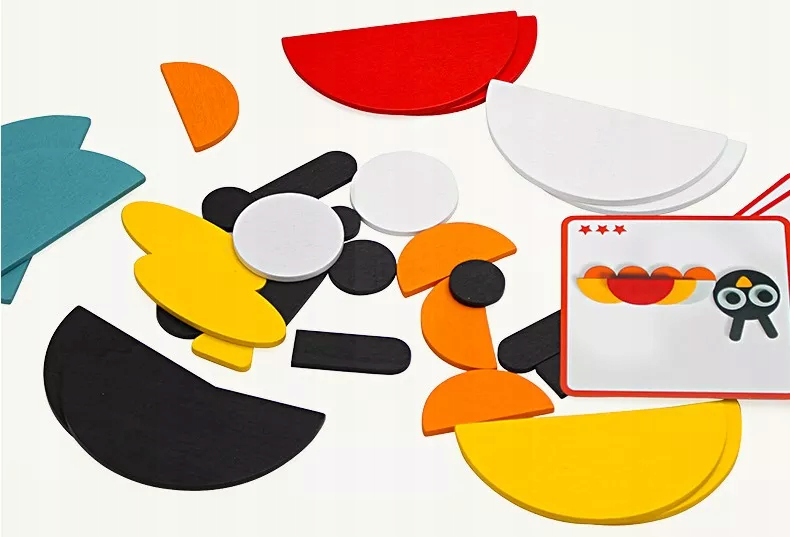 Набор состоит из 29 деревянных красочных элементов различной формы, из которых мы можем составить различные фигурки и животных, например, лисичку, краба, бабочку и многих других - единственное ограничение - это наша фантазия.