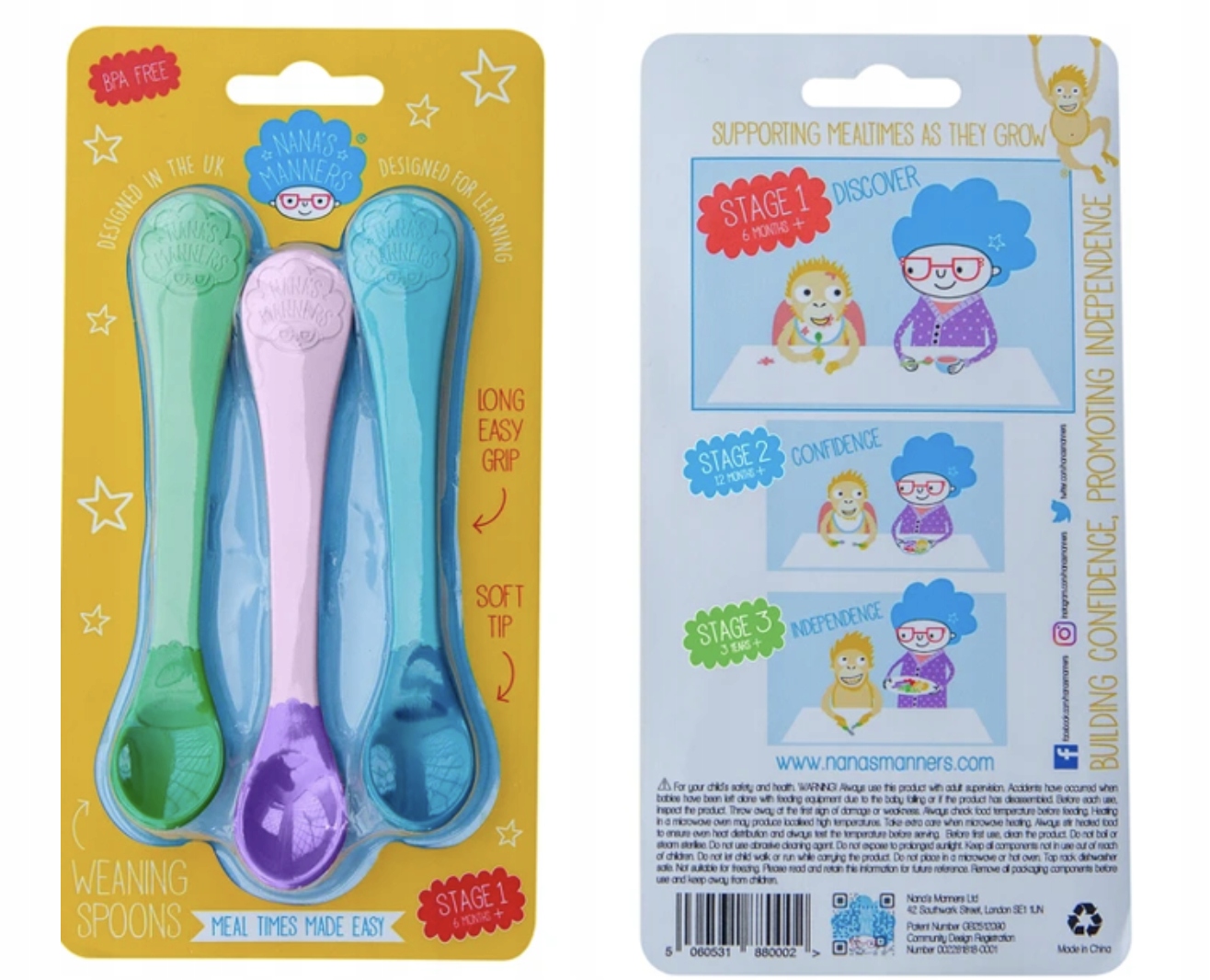 Предупреждения: Используйте под присмотром взрослых. В случае каких-либо повреждений выбросьте продукт. Всегда проверяйте температуру еды, прежде чем подавать ее ребенку. Перед первым использованием вымойте изделие. Не кипятить и не стерилизовать. Не подвергайте воздействию солнечных лучей в течение длительного времени. Не ставьте в микроволновую печь или духовку, не замораживайте. Позаботьтесь о безопасности вашего ребенка, не позволяйте ему бегать с ложкой во рту. Любой силикон может обесцветиться при контакте с пищевыми продуктами, такими как томатный соус, свекла или морковь. Любое изменение цвета не является дефектом продукта и не влияет негативно на его использование.