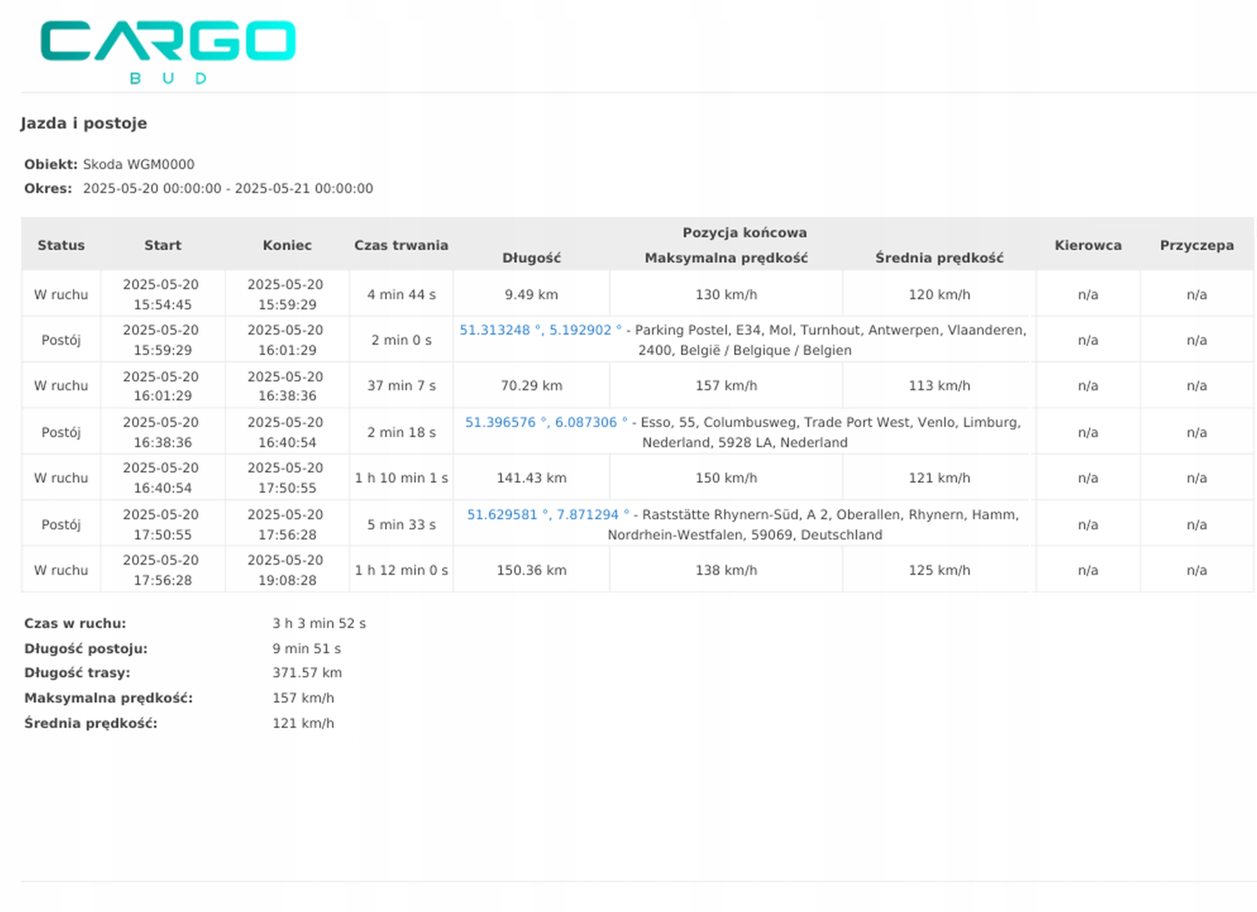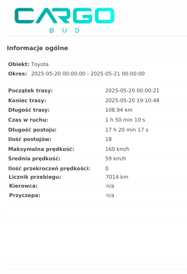 В приведенном ниже отчете вы можете увидеть примеры данных из системы Cargogps - подробно показывают каждый раздел маршрута, остановки, скорость и даже время работы двигателя. Это мощный инструмент, который позволит вам: