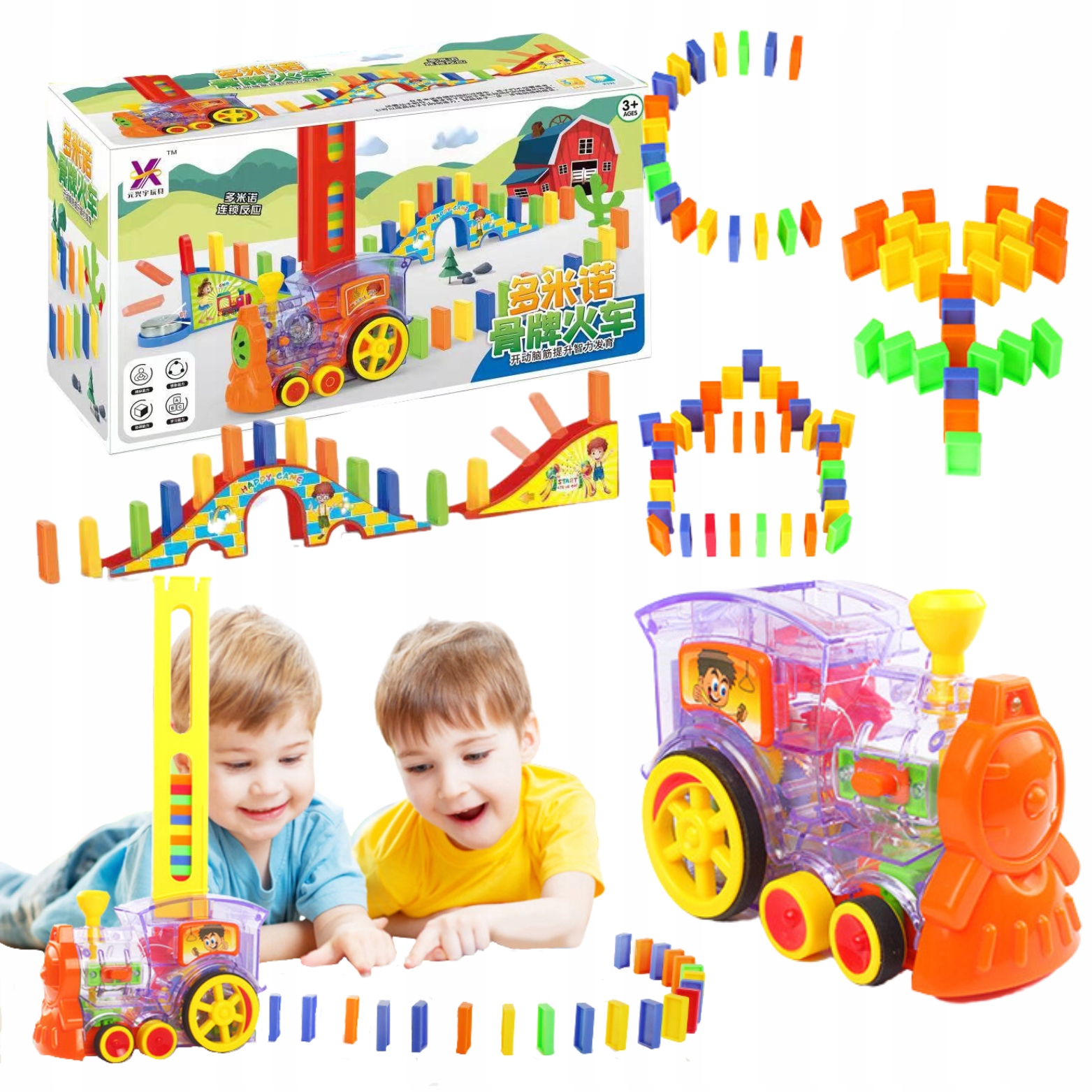 - Красочный паровозик строит ряды домино, которые потом можно красиво сбить и блоки один за другим будут падать. Просто загрузите магазин, входящий в комплект, нажмите кнопку, и паровоз поедет вперед, оставляя позади вертикально расположенные кубики домино.