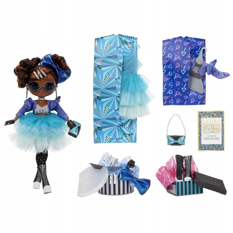 У куклы Мисс Глэм целых 5 стилей для вечеринок. Вы также можете комбинировать одежду любым способом, чтобы создавать новые образы. В комплект входит тюлевая юбка с рюшами, приталенная юбка, топ и жакет. Завершить весь образ можно большим синим бантом и заколками.