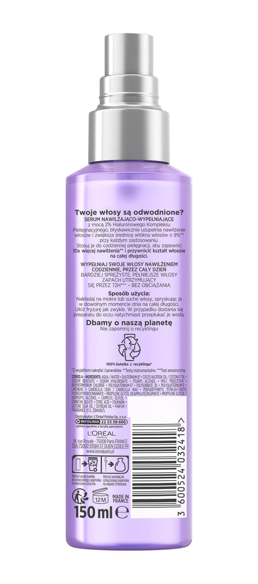 Увлажняющая и заполняющая сыворотка L'Oreal Paris Elseve Hyaluron Plump обеспечивает на 10% больше увлажнения, не утяжеляя. Это последний шаг в правильном уходе за волосами, лишенными блеска и объема, но не менее важными. Благодаря формуле, не требующей смывания, он закрывает кутикулу волос, разглаживает их и обеспечивает длительное увлажнение. Наносить сыворотку в виде спрея можно на пряди от середины их длины до кончиков. Особое внимание уделите тщательному распределению продукта, чтобы каждый волосок был должным образом защищен. Облегчает расчесывание и придает волосам красивый, здоровый блеск.