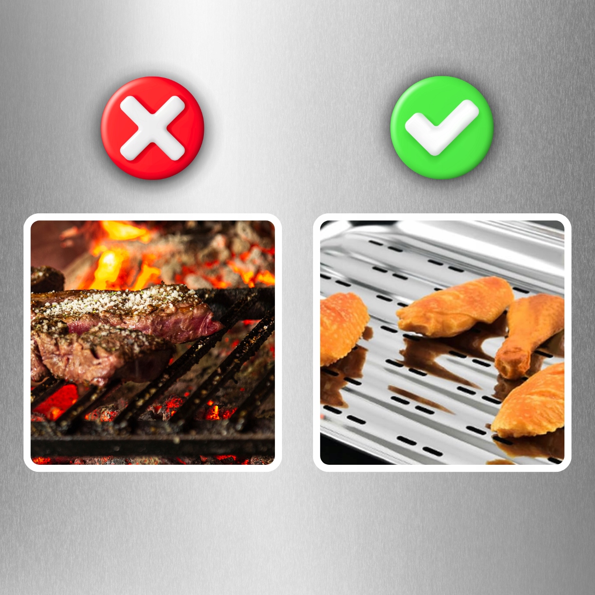 Жир от посуды течет через отверстия, не шипят и не создает кусающий дым. Гриль остается чище, и вы избегаете канцерогенных паров.