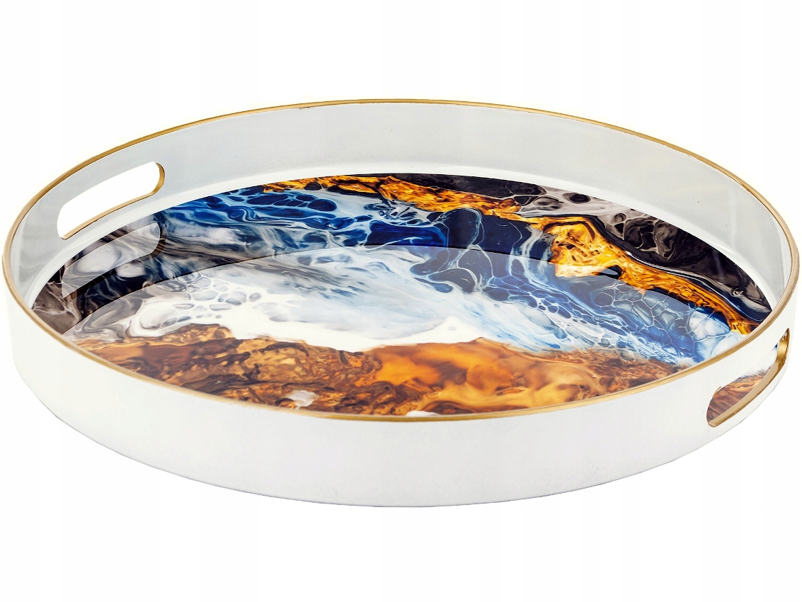 - Круглый поднос, украшенный привлекательным «мраморным» мотивом.