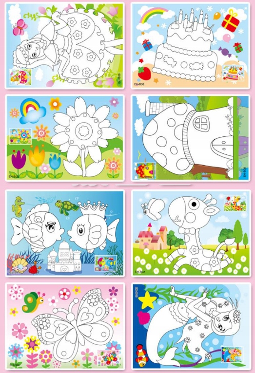 Поиграв с разноцветными бриллиантами, ребенок может перевернуть картинку. На обратной стороне каждого листа находится раскраска, которая дополнительно увлекает ребенка и доставляет ему еще больше удовольствия.