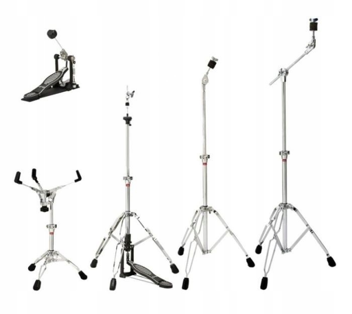 Набор включает в себя твердый хромированный штатив 400 серии и одну ногу (педаль в штаб -квартиру) в той же формуле. Все нити штатив с повышенной прочностью. Двойные ножки в штативах завершены с не -сластичными наложениями. Все штативы солидны и стабильны