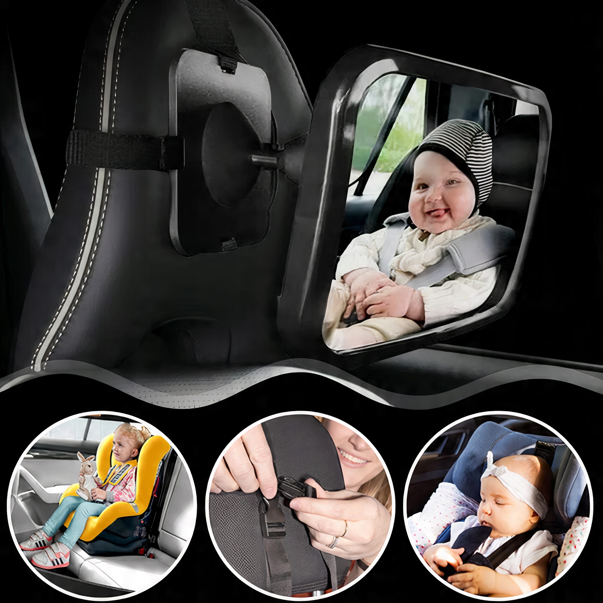 ✔️ Безопасность прежде всего✔️Зеркало, оснащенное четырьмя прочными крепежными ремнями, надежно удерживается на месте, обеспечивая постоянный уход за ребенком. безопасность ребенка. Правильно подогнанные и регулируемые ремни гарантируют, что зеркало останется на месте, независимо от неровностей дороги.