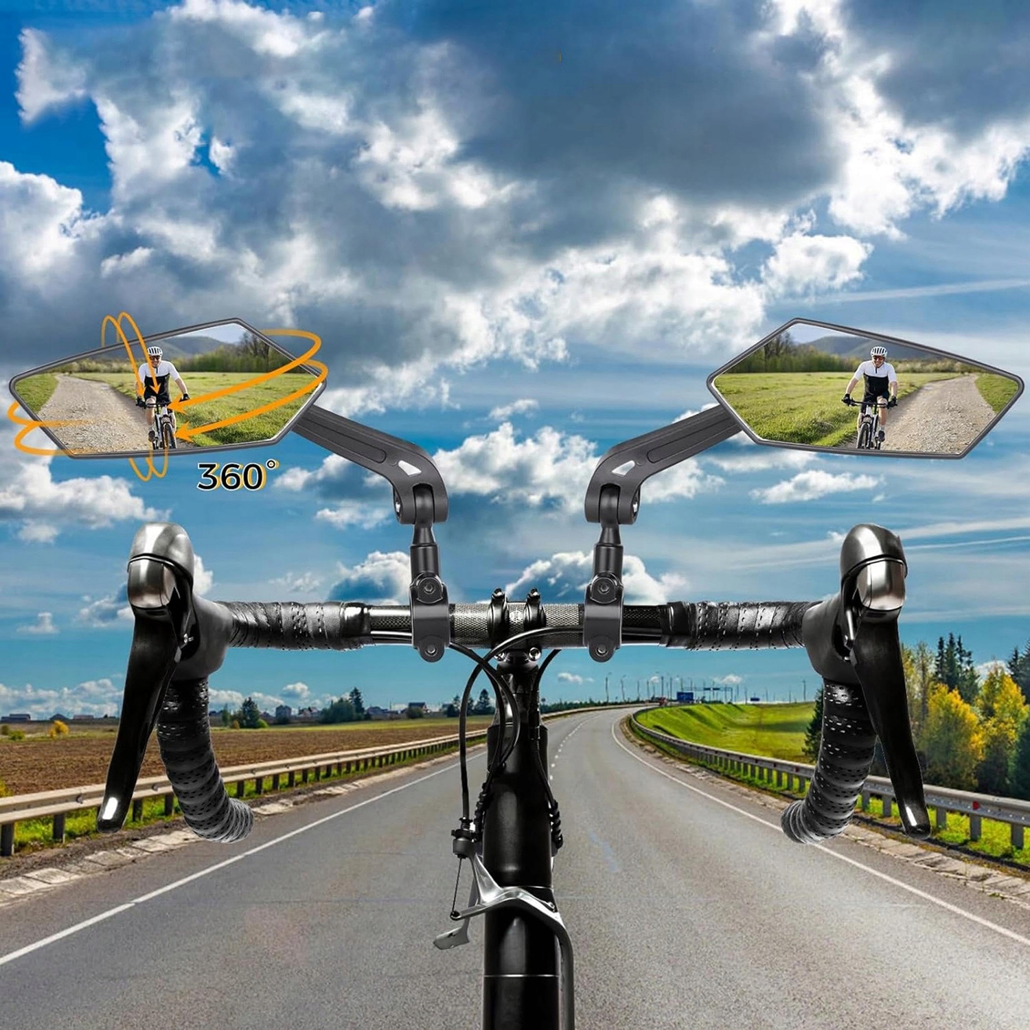 Поворотное и регулируемое: это велосипедное зеркало поворачивается на 360 °. Перемещайте и перемещайте опорную планку в любое время под разными углами, чтобы видеть свет в разных направлениях и дорожные условия в разных направлениях.