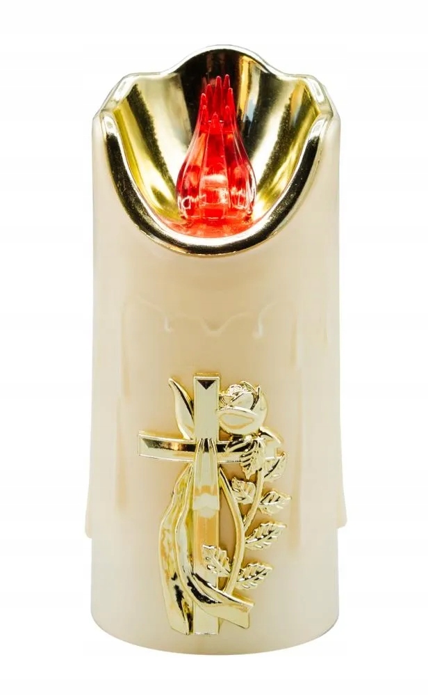 Светодиодная свеча кремового цвета с золотыми акцентами и аппликацией в виде креста и цветов, с красный цвет света. Богатая отделка изделия делает его идеальным в качестве наполнителя для всевозможных фонарей, фонариков или свечей и даже как самостоятельное украшение могилы близких.
