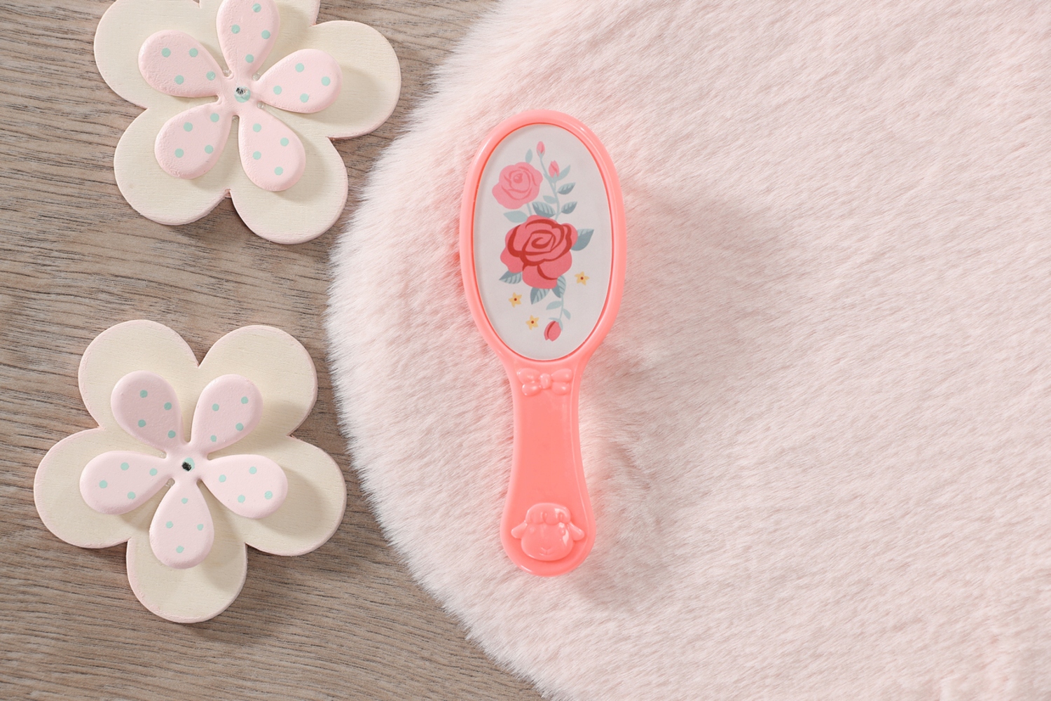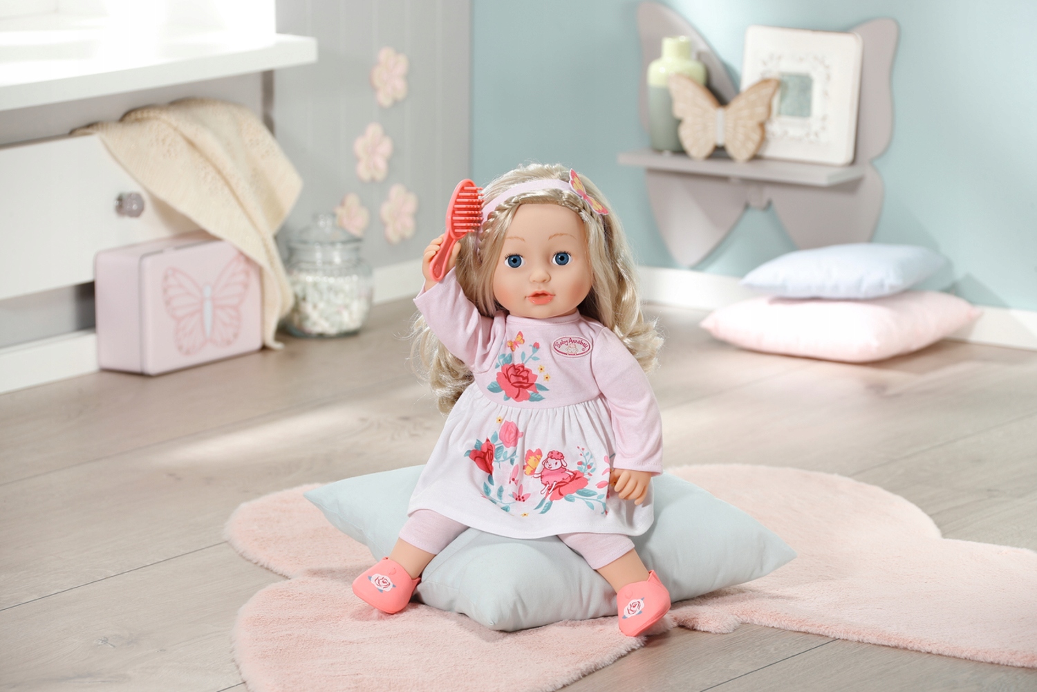 ''София, не двигайся, у тебя в волосах бабочка! О, это всего лишь бабочка на ее повязке... Ее качественные светлые волосы можно укладывать в новые прически и расчесывать розовой щеткой снова и снова.