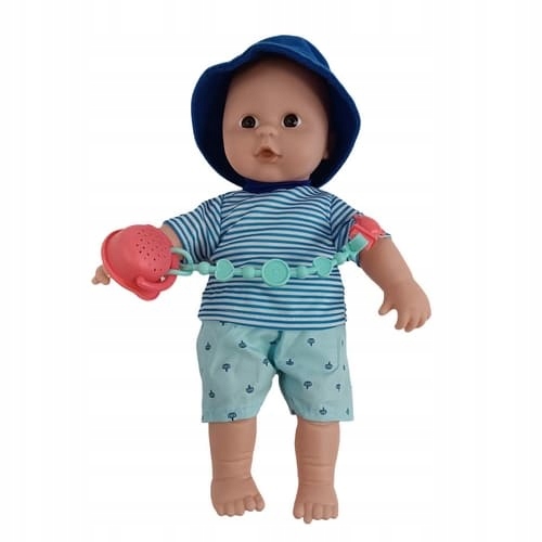 Очаровательная кукла, похожая на младенца, одета в полосатую сине-белую футболку и голубые шорты с нежным узором.
