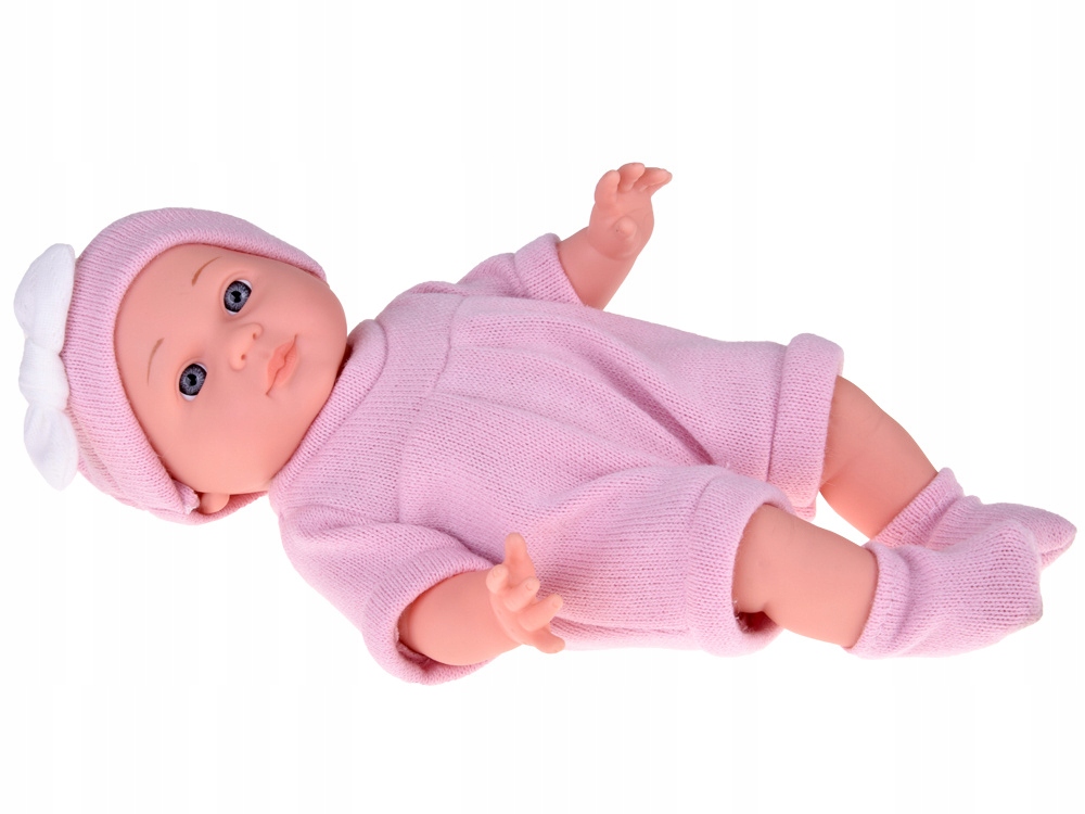 ✨ На кукле шерстяной комбинезон и розовая шапочка с белым бантом, на ногах мягкие носки такого же оттенка розового.