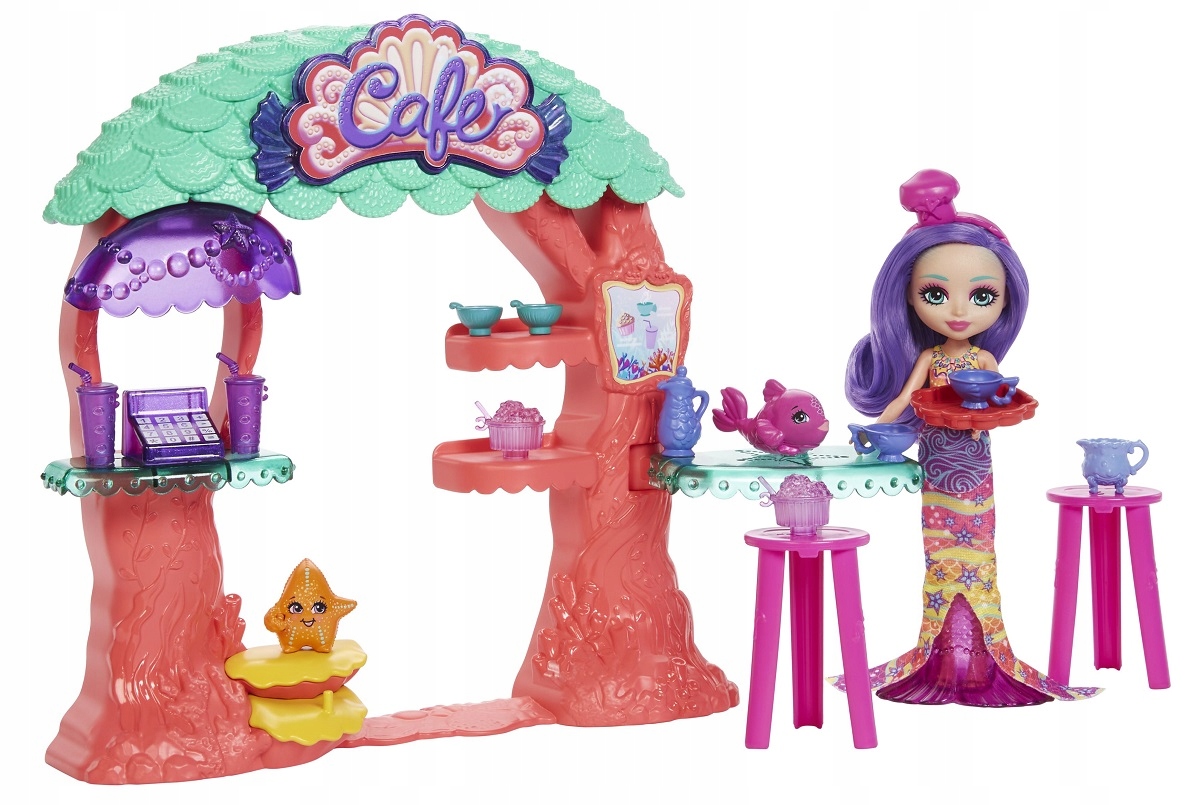 В набор «Подводное кафе Enchantimals» входит кукла-русалка и два зверя, морская звезда и рыбка.