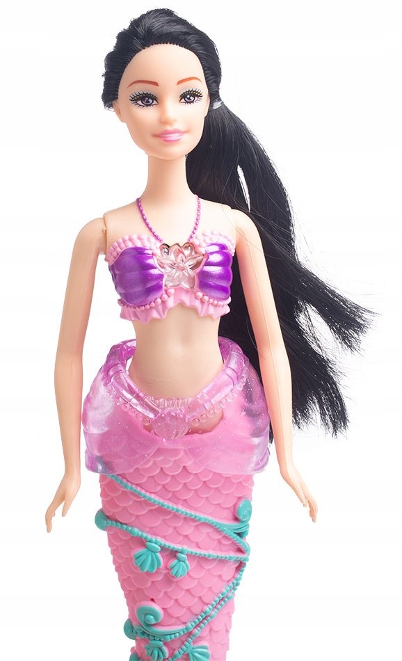 У русалки красивый заштрихованный хвост синего, фиолетового и розового оттенков. Ожерелье из ракушек и красивый хвост делают русалку похожей на настоящую королеву морей. Когда ребенок нажмет на ракушку колье, он услышит веселую музыку, и колье красиво загорится. Батарейки питания входят в комплект.