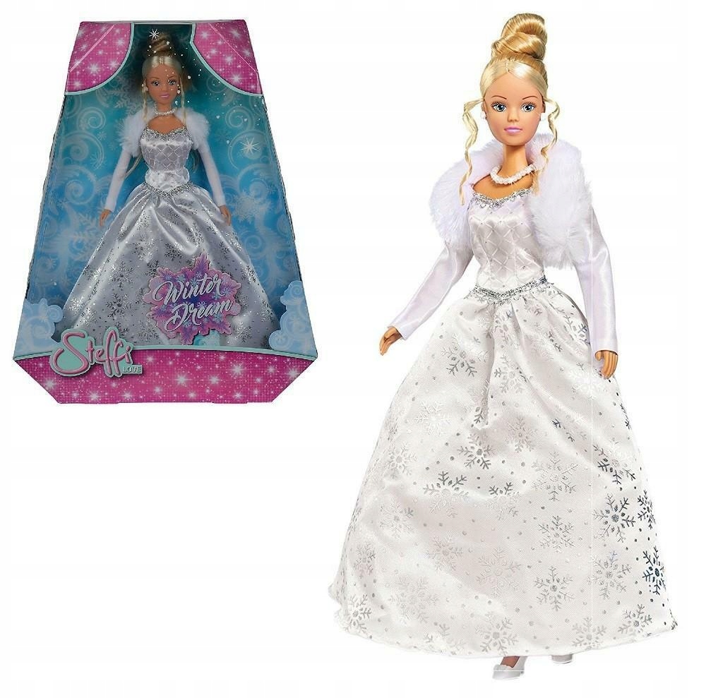 Кукла Штеффи в волшебной зимней версии. Красивое бальное платье с серебряными снежинками, сверкающими при каждом движении. Меховое болеро добавит образу шика. На шее жемчужное ожерелье, в ушах белые серьги.
