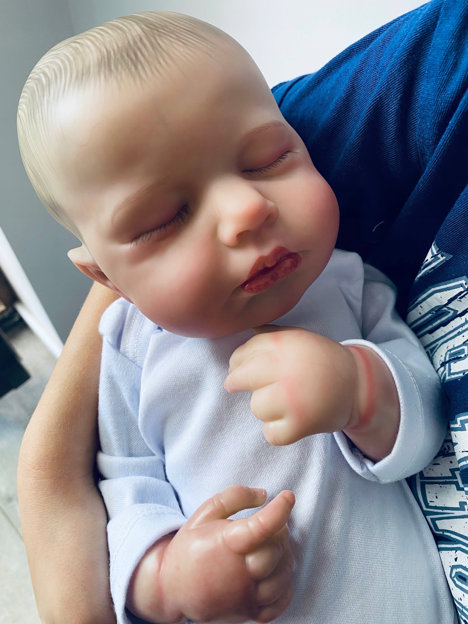 Силиконовая кукла, расписанная вручную. Силиконовые ручки, ножки и голова с нанесенными отпечатками пальцев, волосками, румянцами и всеми деталями, которые есть у живого новорожденного. Живот тканевый, наполненный и мягкий. Ноги и ручки можно двигать в разные стороны.