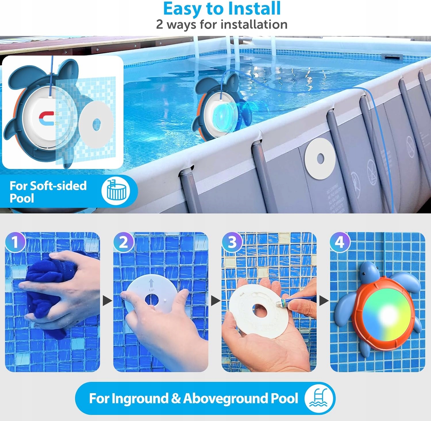 - Легкая сборка - установка наших ламп бассейна - это детская игра, это займет всего несколько минут. Мы предлагаем два практических варианта установки: ① Интегрированный магнитный, предназначенный для бассейнов заземления и ② металлические пластины для грунтовых бассейнов. Оба метода являются пользовательскими, что позволяет легко удалить и чистить.