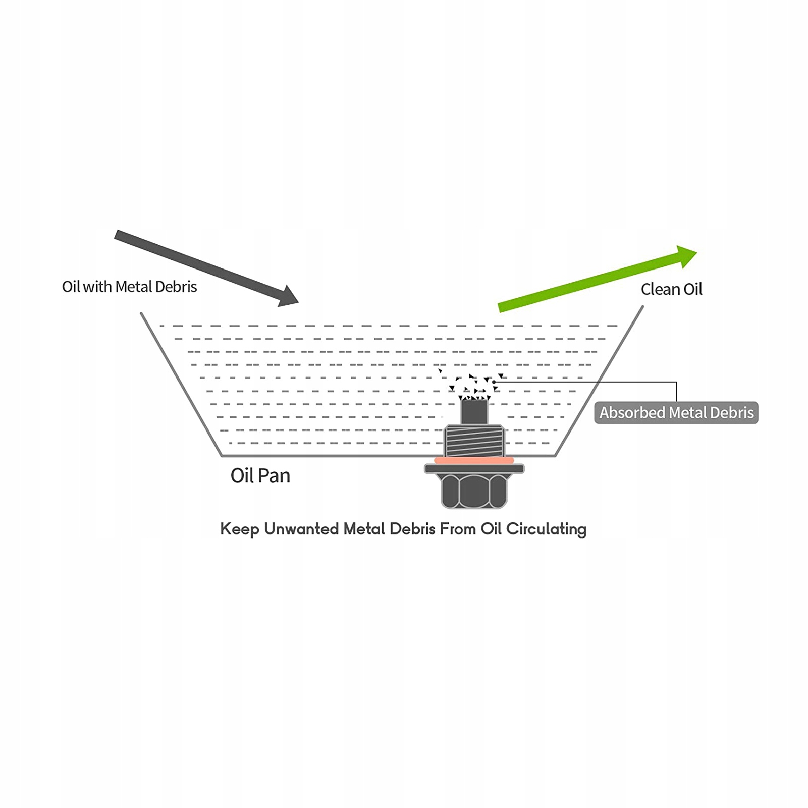 - Магнитная сливная пробка поглощает металлическую стружку из масла, чтобы уменьшить износ движущихся частей двигателя.