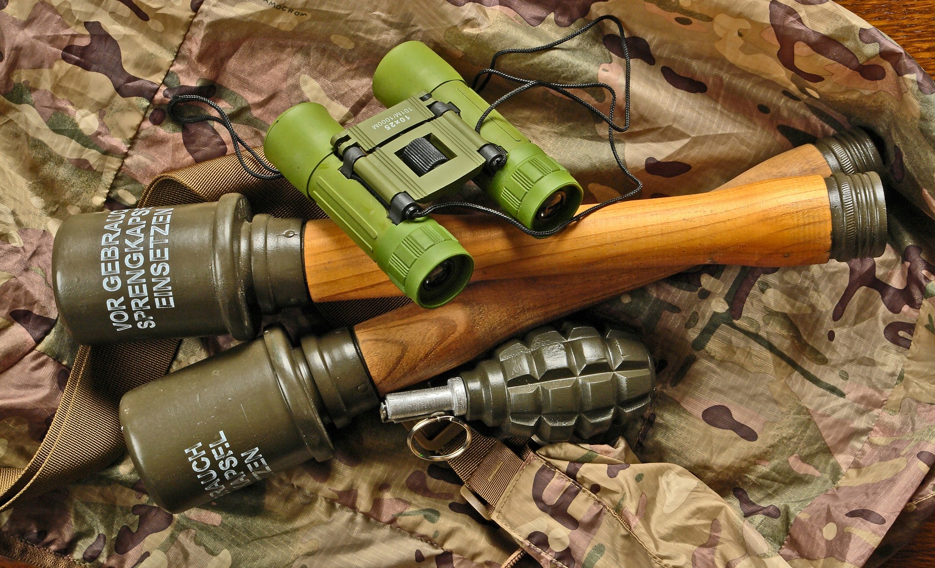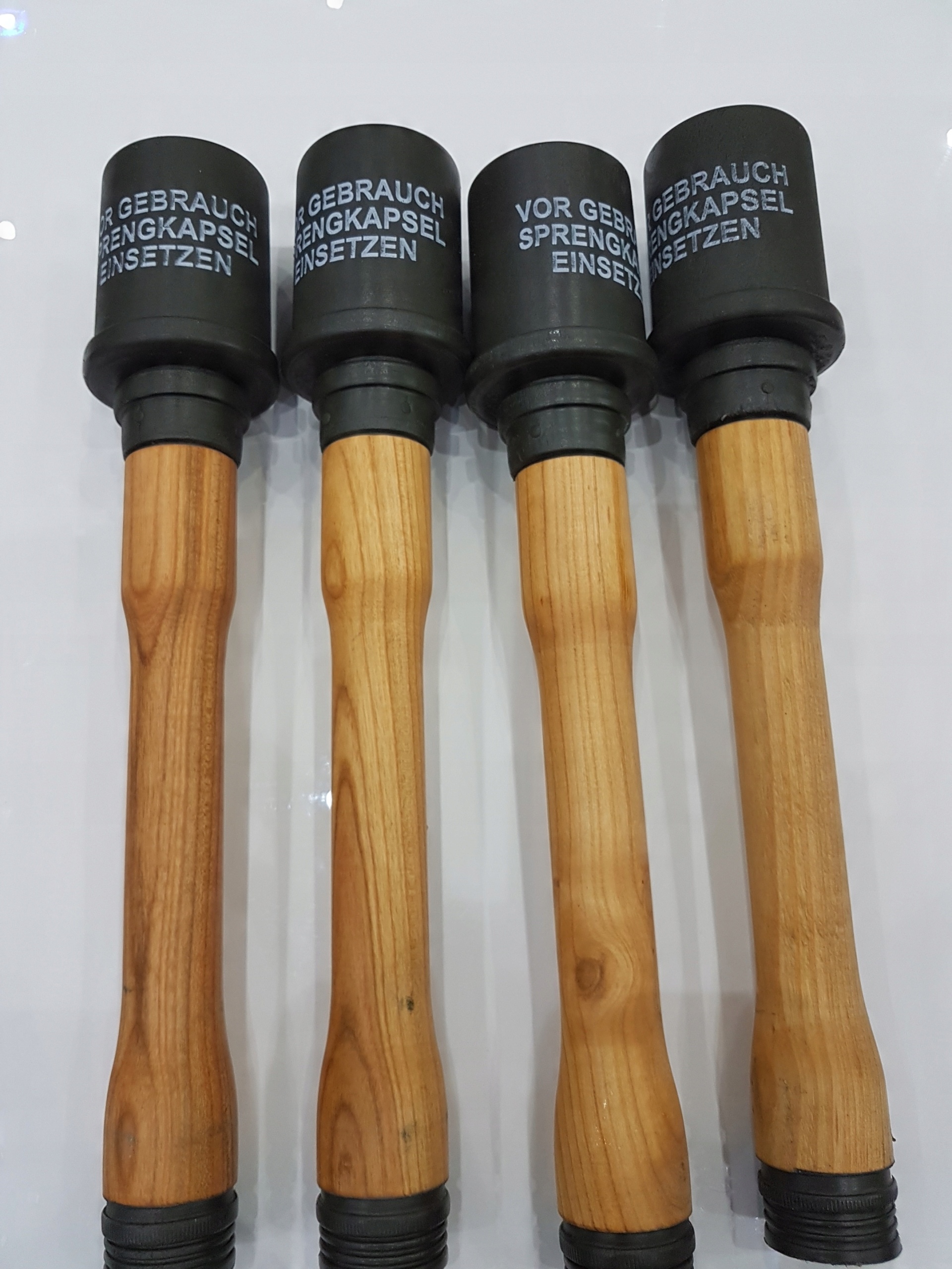 хорошо -приготовленная реплика при сохранении исходной формы и масштаба. Сделано из опытного дерева и покрыта оригинальной военной краской в цвете зеленого коврика хаки. В этой копии нет резьбовых элементов. Он сделан из одного куска дерева.