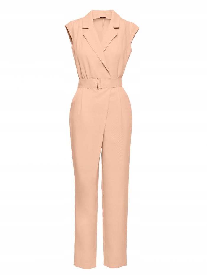 Ткань один костюм Ноги сузились вниз с декоративной асимметрией на стороне вершина конверта без рукавов с воротником и v -neckline На талии спереди, застежка для мини -надки и покрытый отчаянный замок Задняя часть талии гибко боковые карманы Основание с прикрепленной пряжкой Модель высотой 171 см и носит размер спроектирован и сшит в Польше
