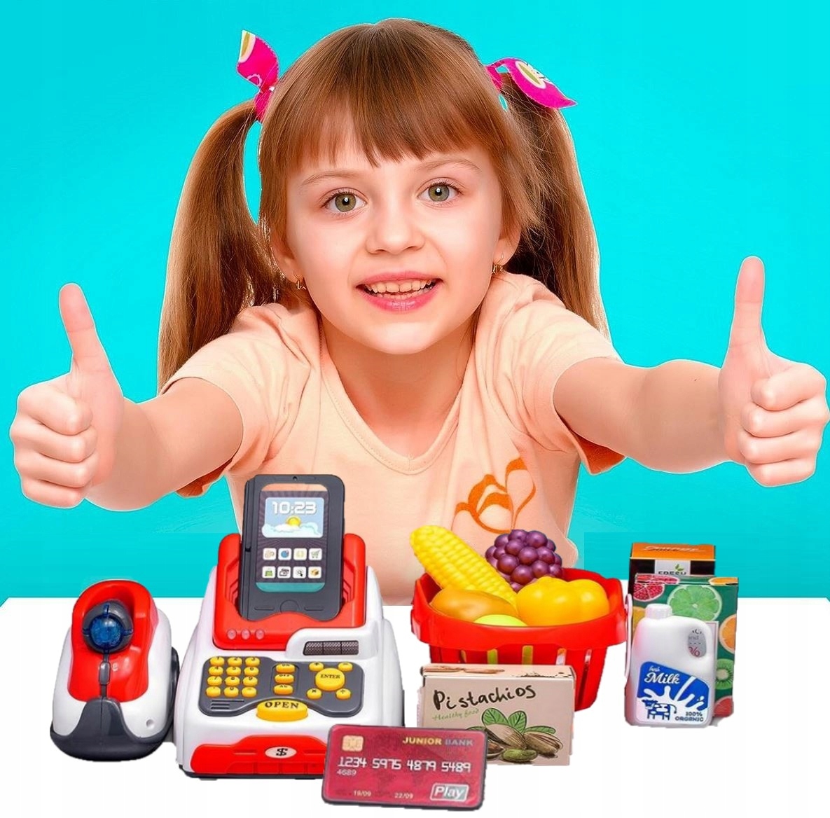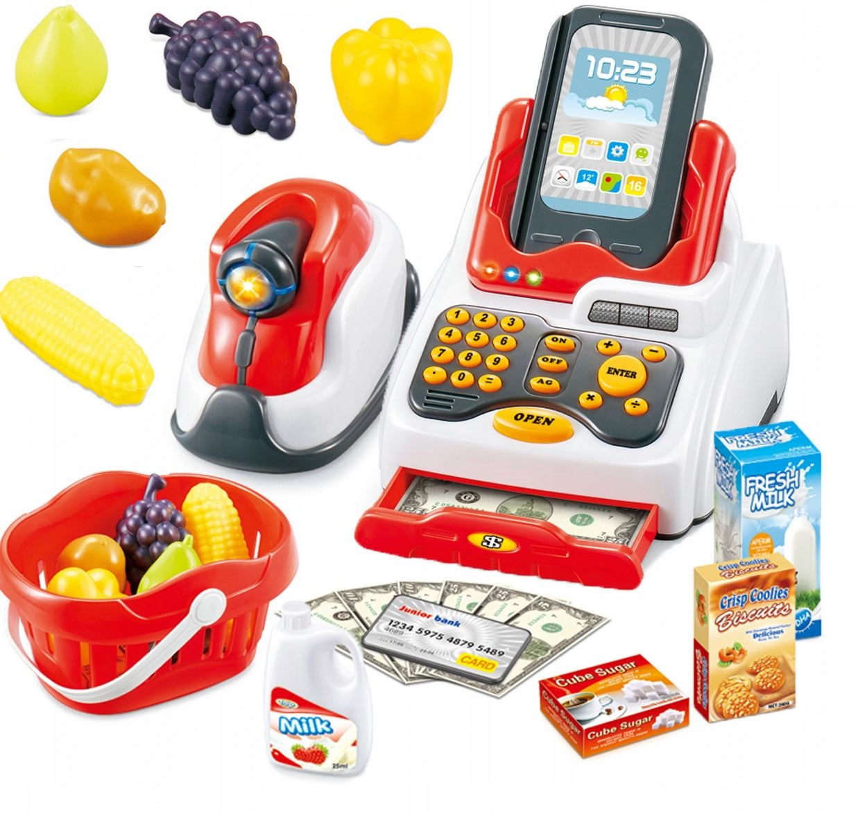 Кассовый аппарат – это реалистичная развивающая игрушка, позволяющая приятно проводить время, развлекаясь и незаметно обучая ваш ребенок умеет считать, цвета, названия овощей, математические действия с числами, стоимость денег, поведение в магазинах и правила покупок :)