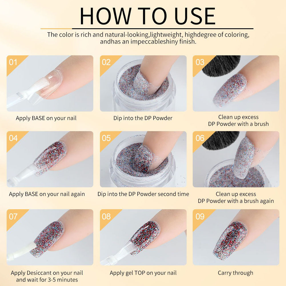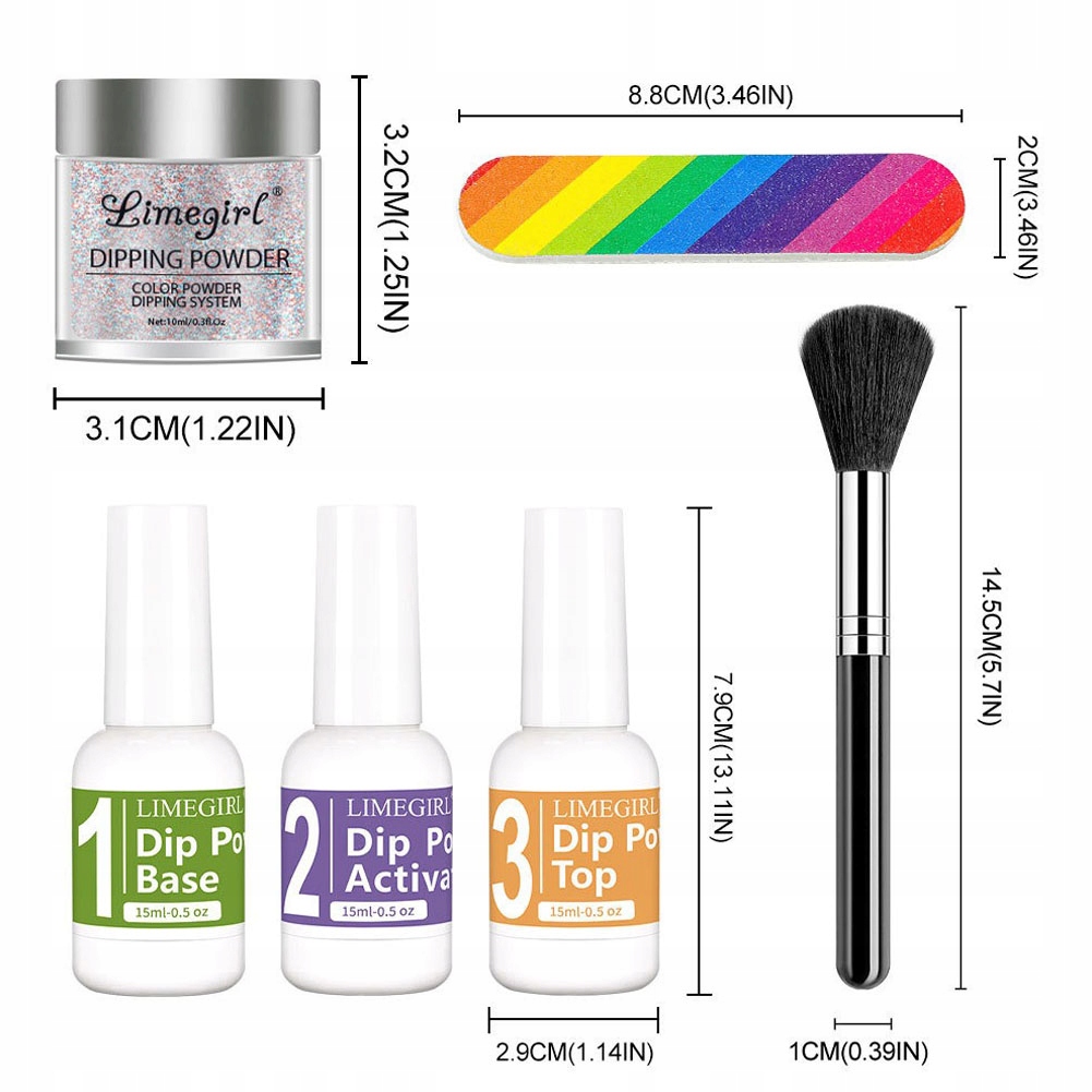 Содержит: 1 банка цветного порошка (10 г в банке), 2: основание, 3: активатор, 4: вверху, пылестная щетка и файл ногтя. Это более быстрый и более простой способ украсить ваши ногти.