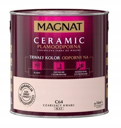 керамическая краска для внутренних работ на основе керамических компонентов и смол и пигментов высочайшего качества. Эта уникальная формула придает краске MAGNAT стойкий цвет, устойчивый к пятнам, стирке и истиранию, а также к интенсивному использованию3. Лакокрасочные покрытия не впитывают грязь и «сложные» пятна1 и устойчивы к дезинфицирующим средствам2.