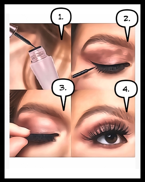 Нанесение ресниц предполагает рисование линии на веке подводкой, ожидание около 5 минут для ее высыхания и прикладывание ресниц к нарисованной линии.