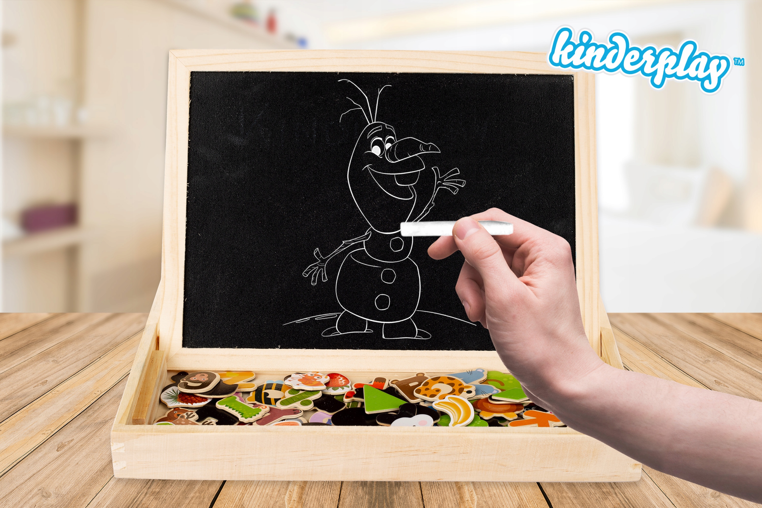 Отличный набор для познавательного и интересного развлечения! Складная деревянная двусторонняя доска и магнитные пазлы. Белая магнитная сторона используется для решения головоломок и письма сухостираемым маркером. Тёмная сторона — это доска, на которой пишут мелом. Каркас и коробка фрезерованы и отполированы - изготовлены из 100% дерева (без искусственных композитов).