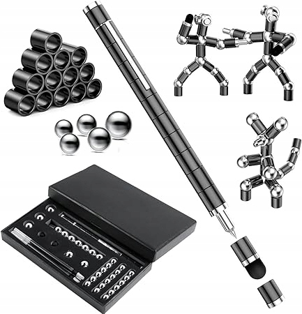 Магнитная ручка сочетает в себе письмо, удовольствие и отдых. В комплект входят 14 магнитных колец, 30 стальных шариков, 2 головки конденсатора и запасные картриджи, все упаковано в элегантную подарочную коробку 🎁. Ручка-антистресс позволяет весело проводить время и создавать разные фигуры, что помогает снять напряжение и сконцентрировать мысли 💆♀️✨. Изготовлен из экологически чистых материалов, удобен для переноски и использования на сенсорных экранах. Это идеальный подарок на многие случаи, например, на день рождения, День отца или Рождество 🧲🎉.