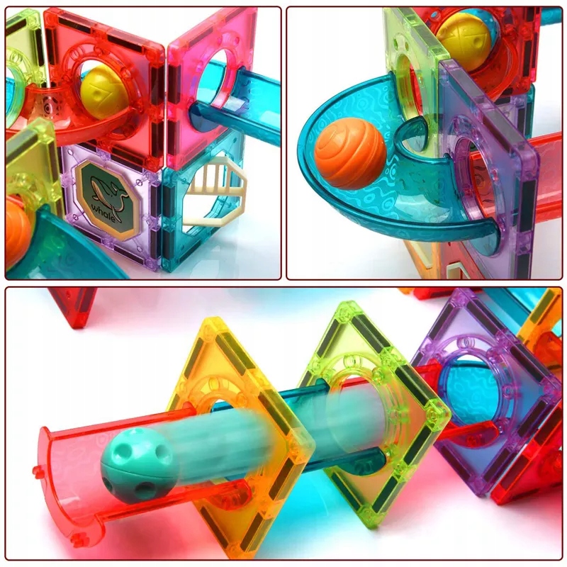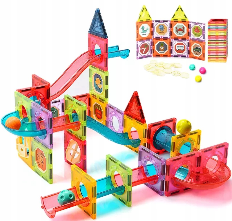 Отличный набор магнитных блоков, сочетающий в себе развлечение и обучение. Он влияет на развитие творческих способностей, ручных навыков, пространственного воображения и концентрации внимания. Это комбинация двух игрушек – магнитных блоков и дорожки для шариков. Магнитные блоки учат творческому мышлению, они оснащены сильными магнитами, допускающими любые комбинации. Они позволяют строить различные лабиринты в любых конфигурациях. В набор также входят шарики, которые мы можем перебрасывать по созданной дорожке. Яркие цвета стимулируют зрительное восприятие и способность наблюдать. Они влияют на чувства. Это идеальный набор для маленького конструктора. Внутри квадратов можно разместить вращающиеся окошки, которые можно украсить разноцветными наклейками.