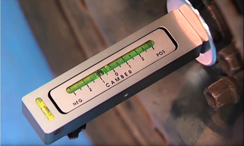 2. Поместите индикатор развала в центр планки и определите положительный или отрицательный угол развала.