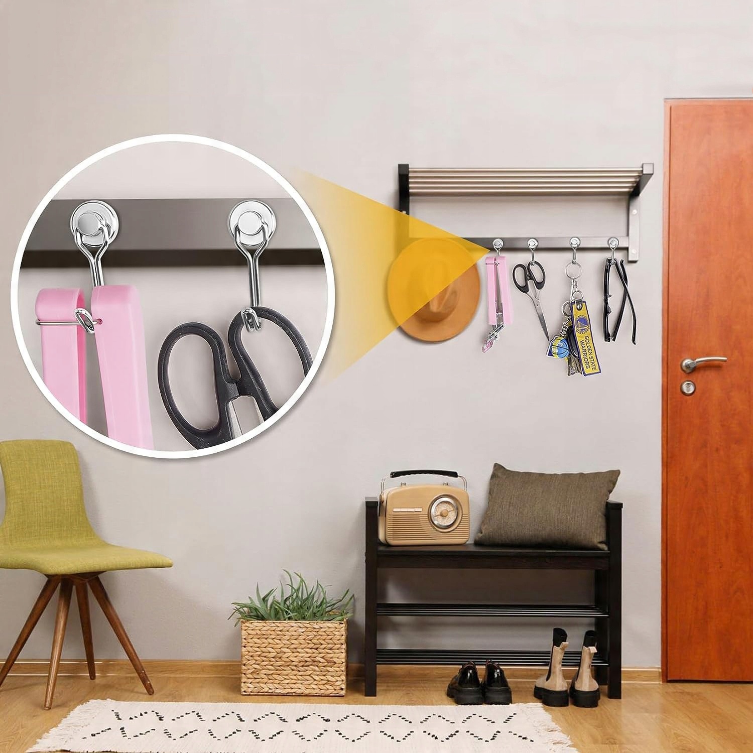 🪝 【Прочные мини-магниты-крючки】» Не стоит недооценивать силу этих миниатюрных магнитов-крючков. Они имеют компактный диаметр 16 мм, но их максимальная вертикальная нагрузка составляет 13 кг/30 фунтов, а горизонтальная нагрузка — 4,5 кг/10 фунтов. Эти мощные магниты позволяют надежно прикрепить и разместить календари, кухонную утварь, ключи или другие легкие предметы на магнитных поверхностях, таких как холодильники.