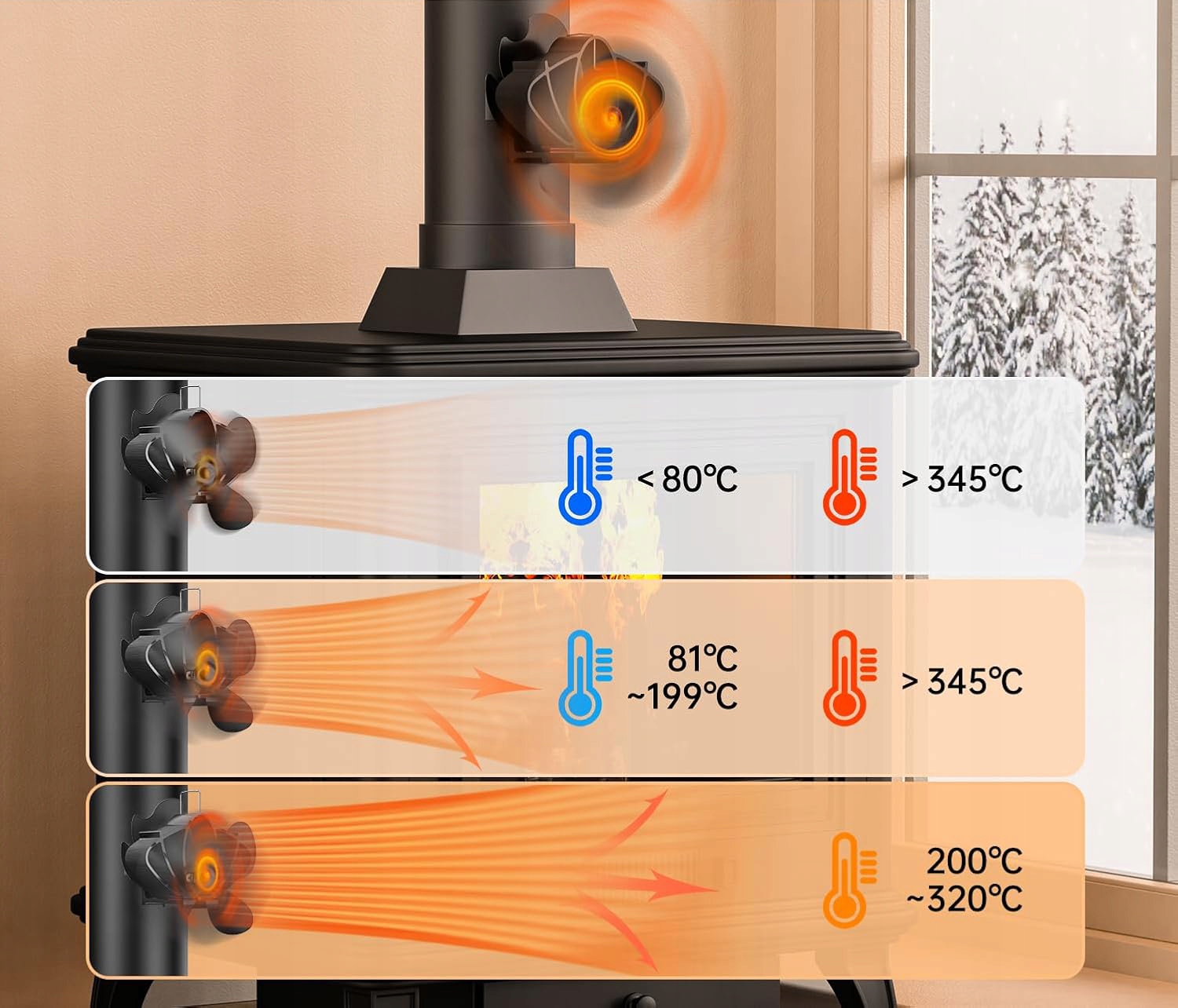 Улучшенный вентилятор для камина без электропитания — идеальное решение для людей, которые хотят повысить эффективность своей системы отопления. Благодаря улучшенной конструкции лопастей наш вентилятор создает более высокую разницу температур, что приводит к более быстрому вращению вентилятора и увеличению объема воздуха. Теперь можно достичь впечатляющей эффективности 230 CFM, что означает увеличение эффективности на целых 80%. Кроме того, вентилятор защищает свои компоненты, что продлевает срок их службы.