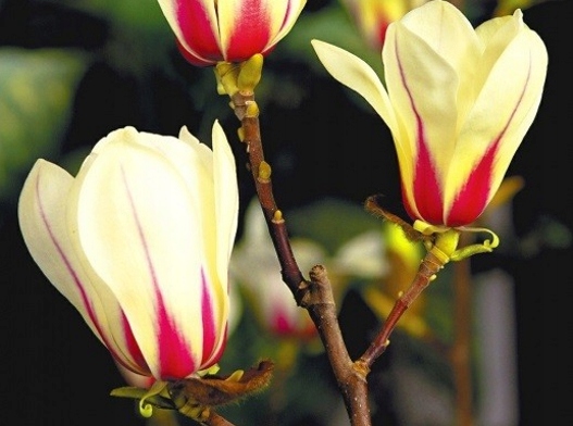 Магнолия САНРАЙЗ – новый эффектный сорт с Дальнего Востока. Цветки необычные, ароматные, с двойной коронкой в форме чаши; в бутоне зеленоватые, после раскрытия кремовые с прожилками огненно-красного цвета, идущими со дна чашечки.