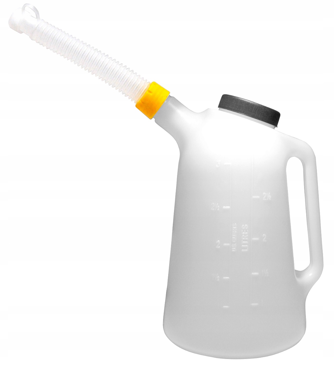 из прочного пластикового PE, устойчивого к эксплуатационным жидкостям, имеет практическую гибкую воронку и прикрученную крышку.