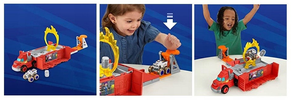 Эта удивительная игрушка превращается из большого грузовика в великолепного трюкача. набор с трамплином, огненным кольцом и верстаком.