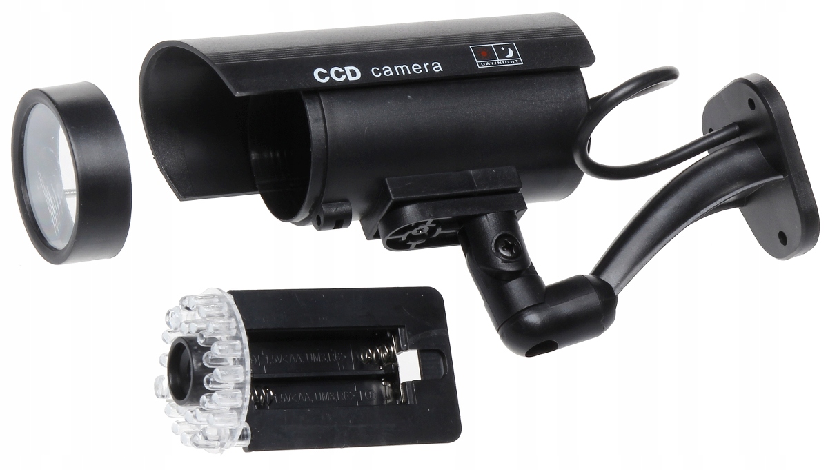 Внешний макет камеры с держателем. Имеет мигающий красный светодиод. Благодаря такому решению манекен привлекает внимание и его легко заметить. Шнур питания, выходящий на стену через крепление, делает ее неотличимой от обычной камеры. Манекен питается от внутренних батареек.