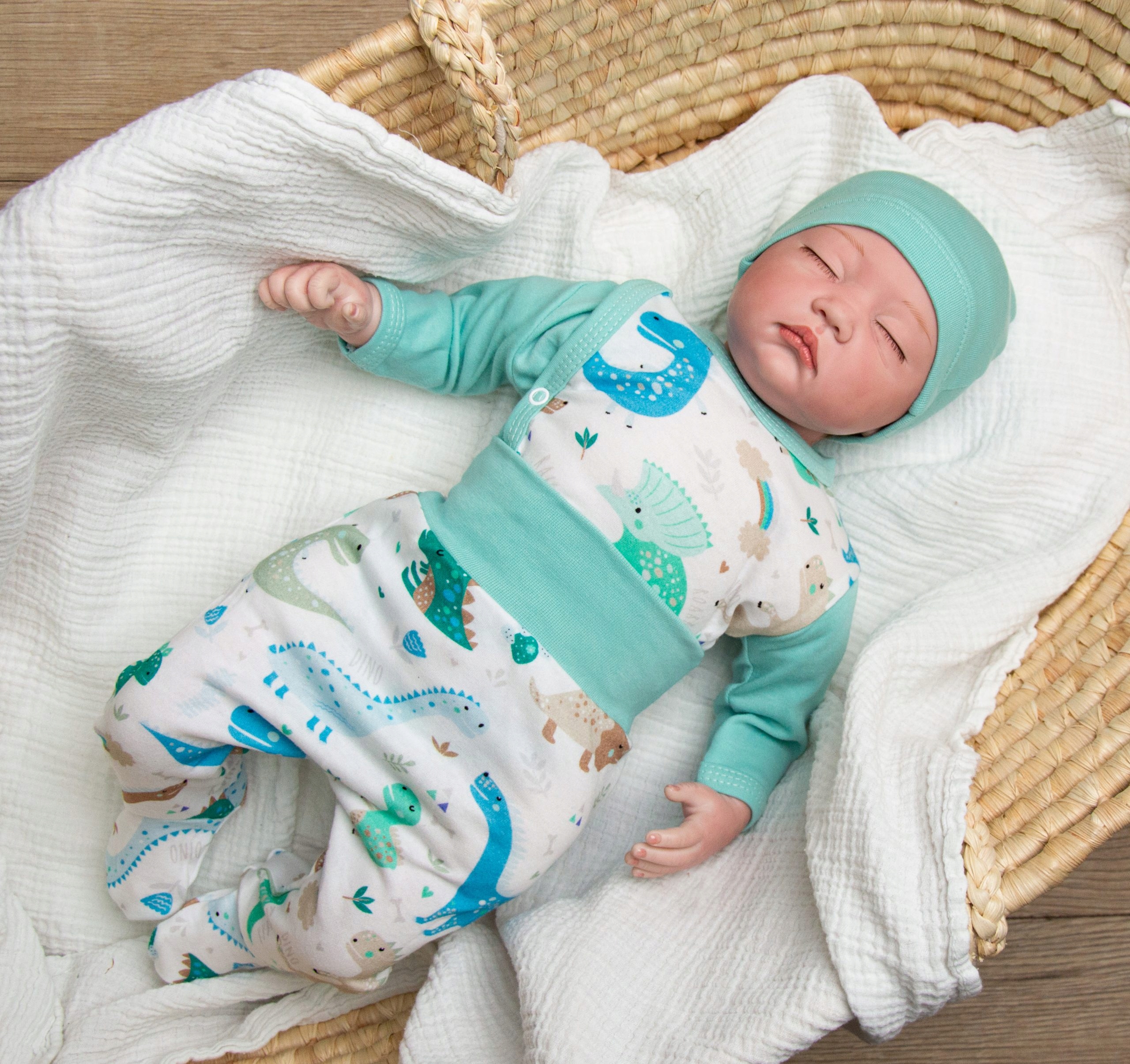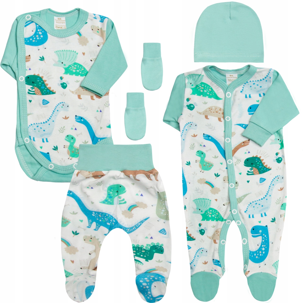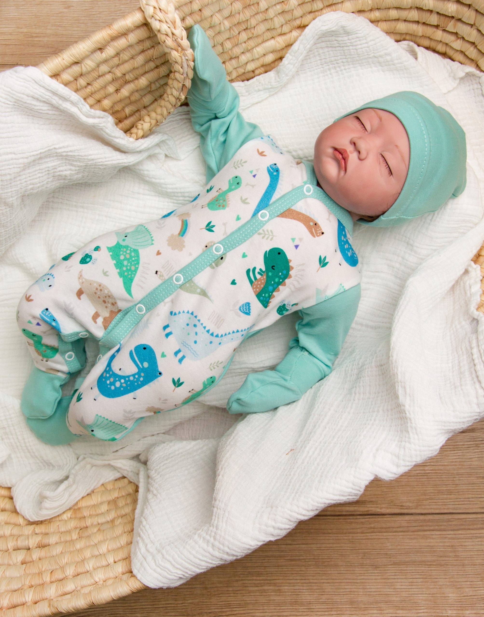 Хлопковая распашонка для новорожденного ДИНО в нежных пастельных тонах с мятными вставками - комбинезон, боди на молнии сбоку, слипы, шапочка и когтеточки.