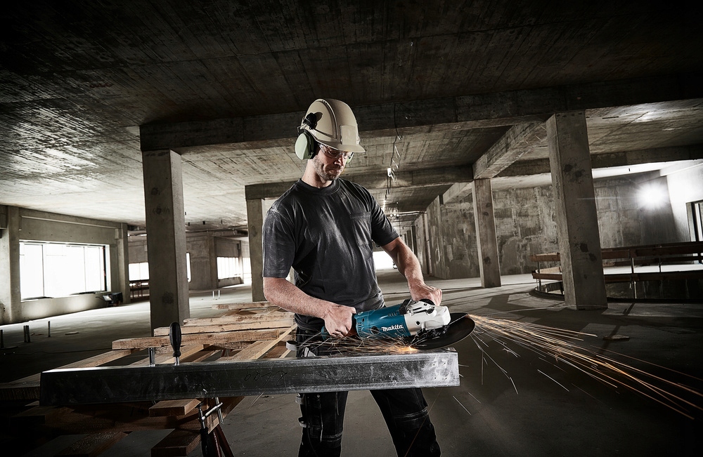 - Makita GA9020RF — угловая шлифовальная машина с диском. диаметром 230 мм и мощностью 2200 Вт.