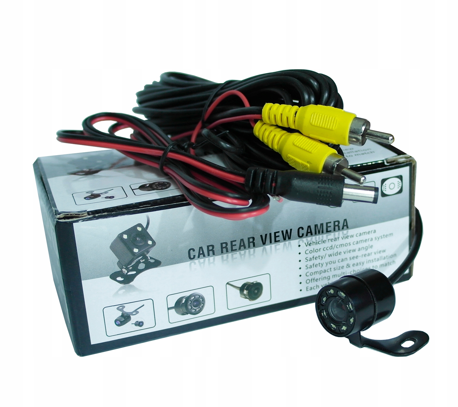 Комплект: 8-светодиодная камера заднего вида с 6-метровым кабелем RCA, кабелем возбуждения и кабелем питания, в комплекте имеется инструкция по подключению на польском языке.