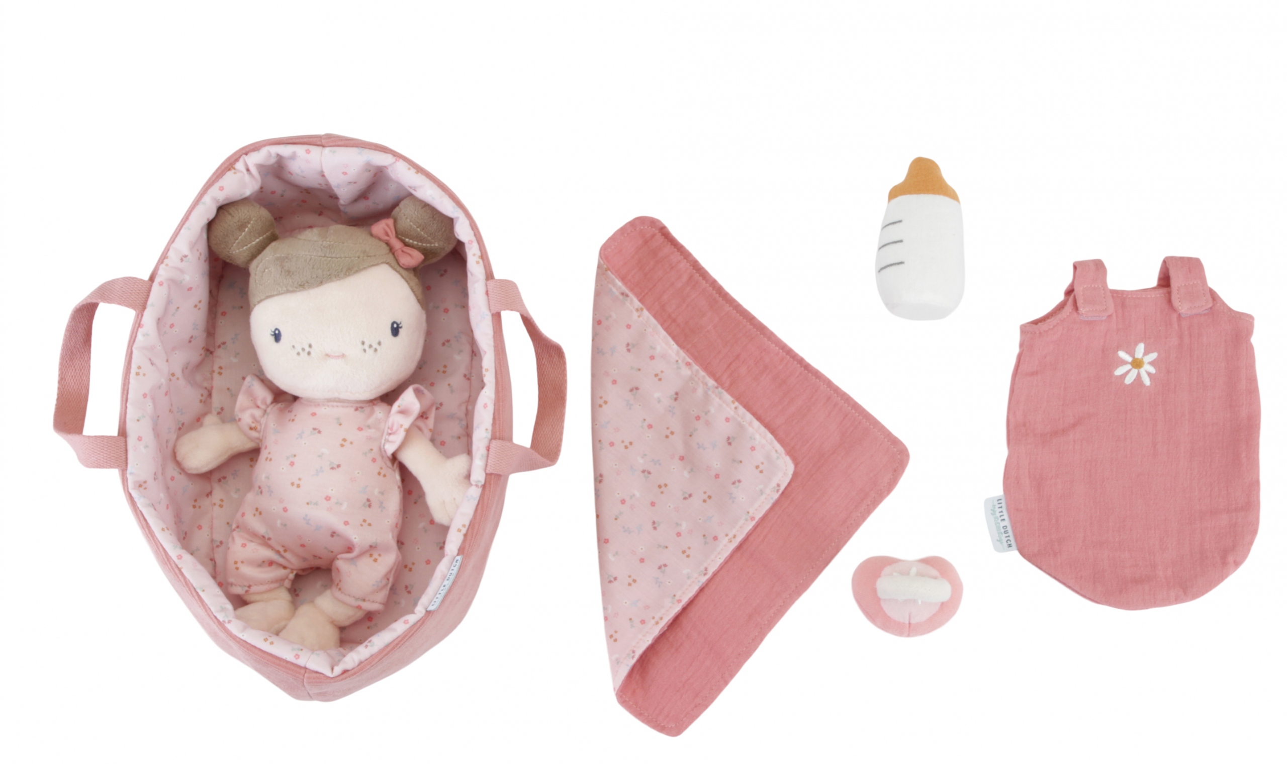 Кукла - это розовый цвет с мотивом из коллекции маленьких розовых цветов. Включает в себя: куклу, съемная одежда, подгузник, двустороннее одеяло и спальный мешок. Набор также включает в себя бутылку и магнитную соску. Ребенок учит уходу за ребенком с раннего возраста. Отличная идея подарка.
