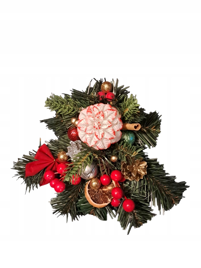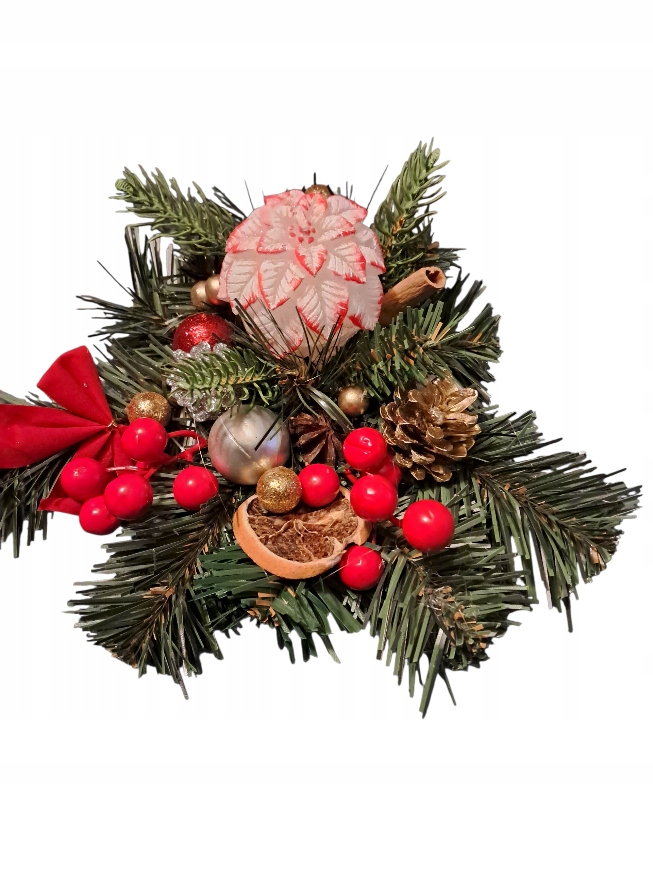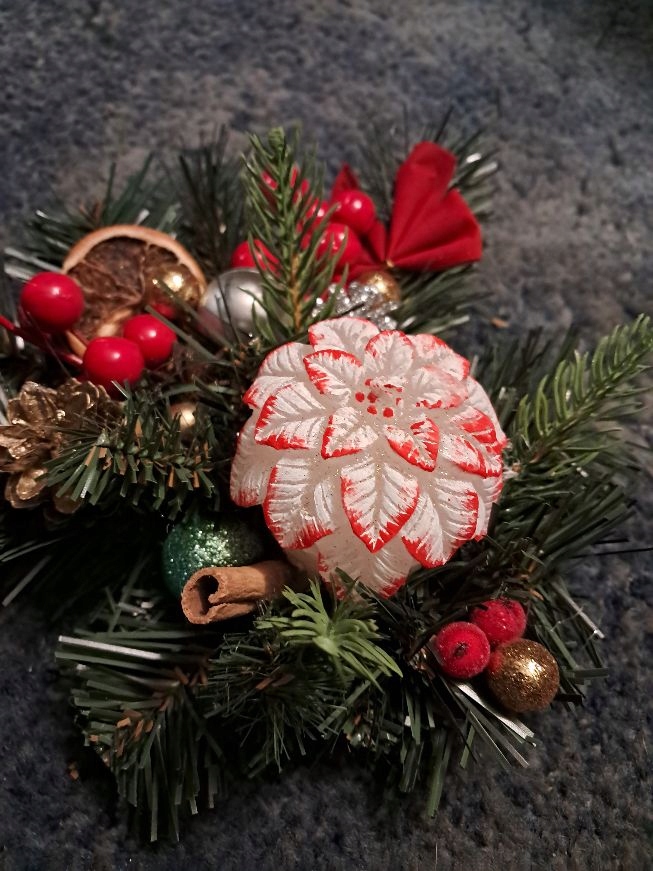 В середине свеча в виде звезды вифлеемского цветка (белая и красная, украшенная блестками) диаметром 7см и 8см. высокий.