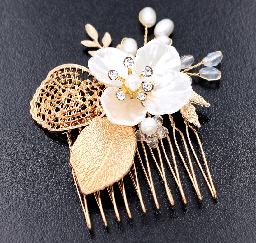 ✅Расческа золотая, что придает ей роскошный вид. и классический вид. Изготовлен из высококачественных элементов, обеспечивает долговечность и комфорт при ношении. Металлические проволоки отделаны белым жемчугом и кристаллами, которые нежно переливаются на свету, придавая шарм и элегантность.