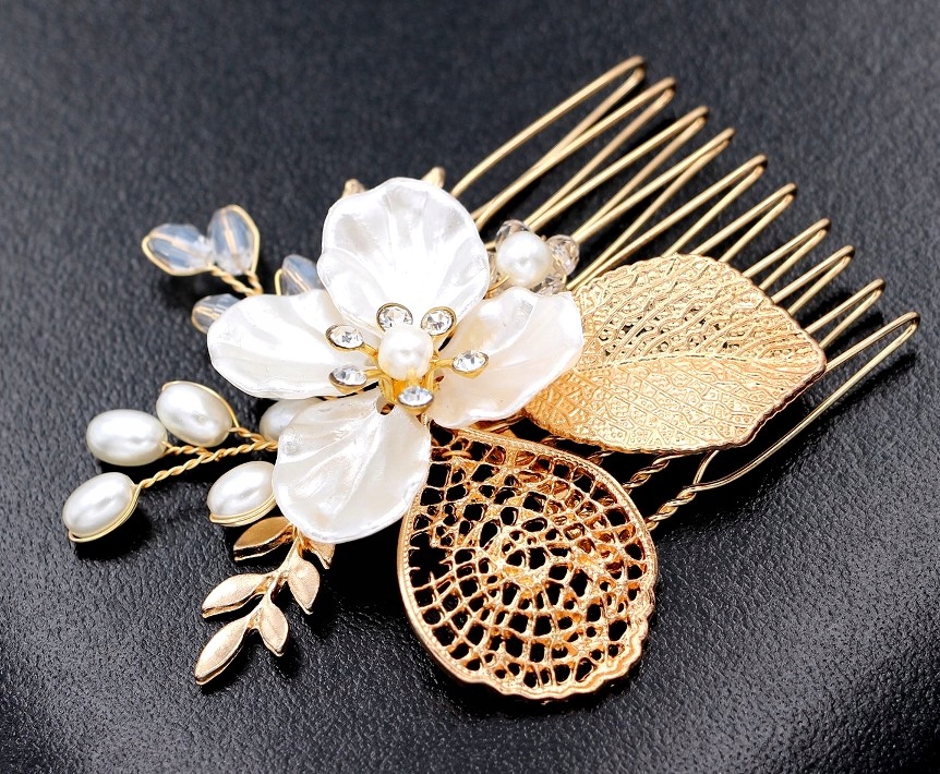 ✅ Основной мотив этого украшения – белый цветок, украшенный жемчугом и кристаллами. Золотые листья разных размеров дополняют целое, создавая гармоничную и красивую композицию, которая идеально впишется в любую свадебную прическу.