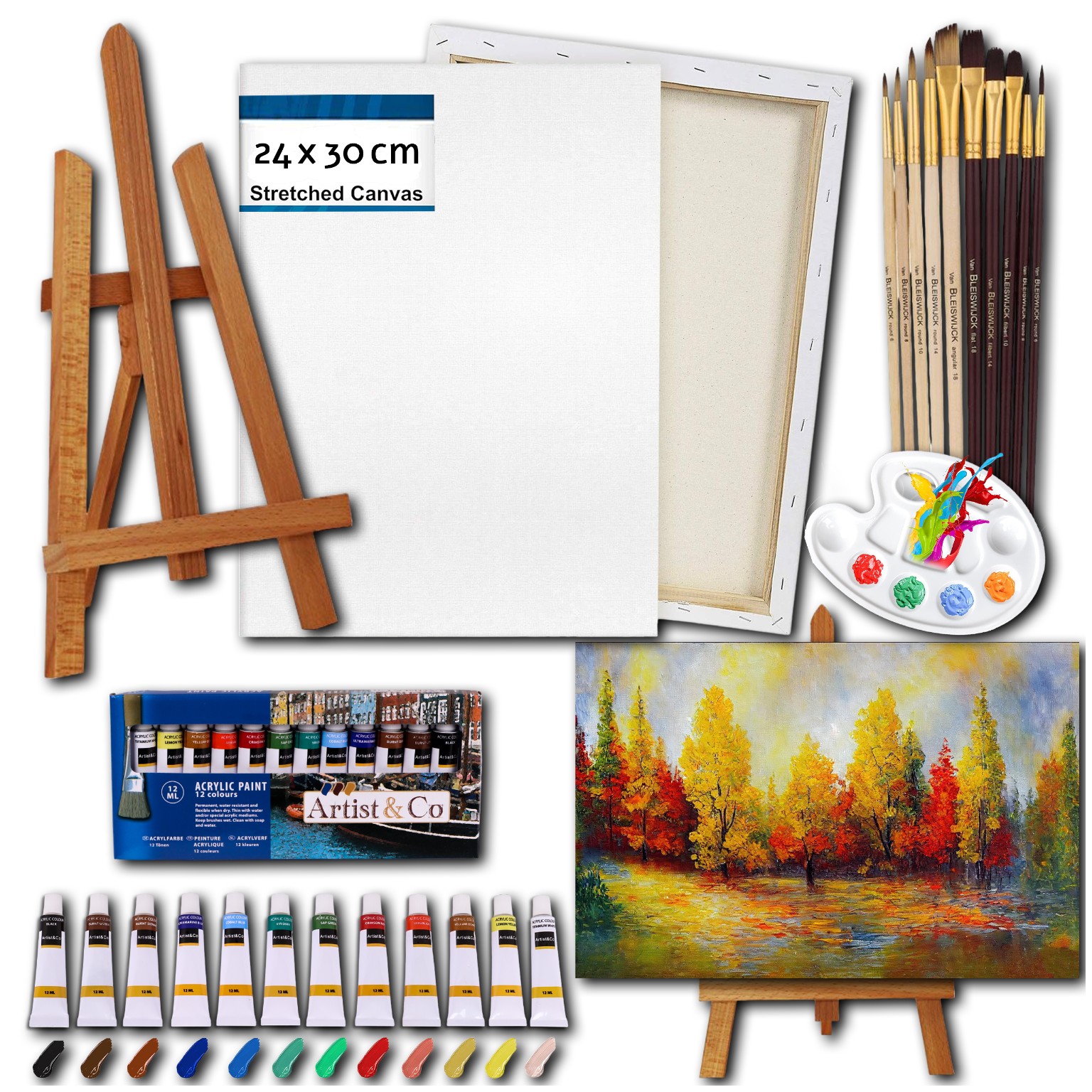 Используя обширный набор рисования , который включает в себя акриловые краски 12x12 мл, длинные художественные кисти, палитра для смешивания красок, столовую живописную мольберт и рисование Canvas .