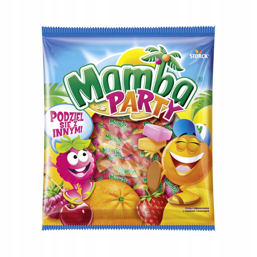 - Mamba Party — это хорошо известные формы классических кубиков Mamba, супергибкой консистенции, с пятью очень фруктовыми вкусами: малина, вишня, апельсин, клубника и лимоны.
