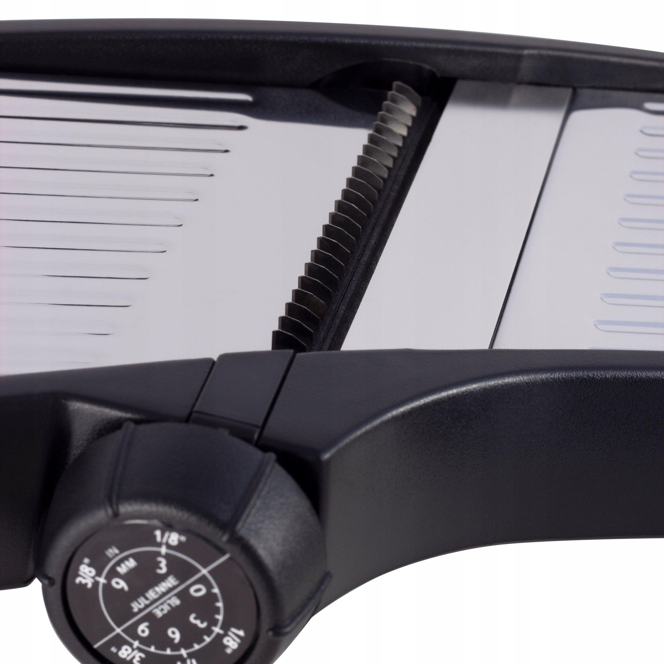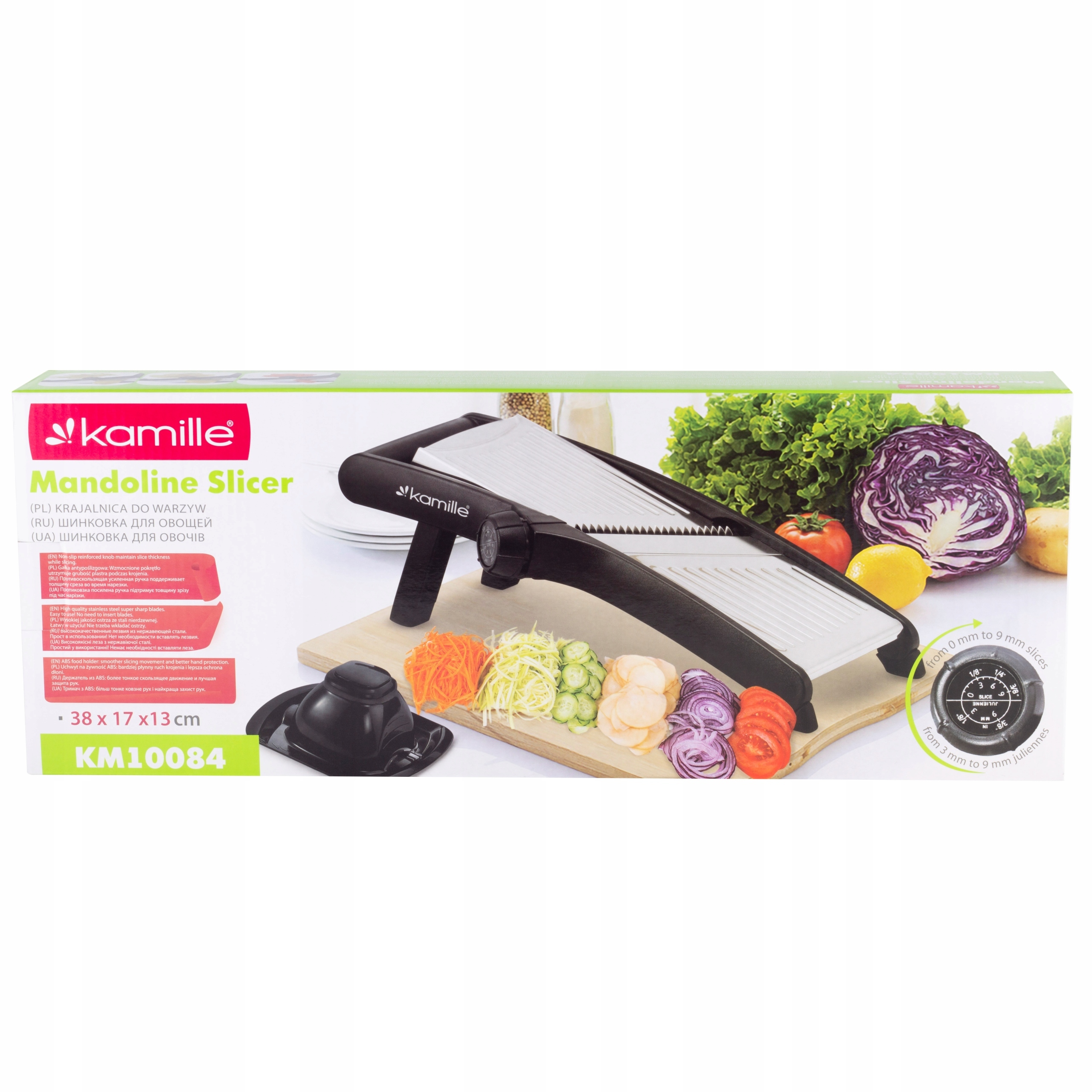 В наборе 3 режущих ножа: в полях - 3/9 мм и ломтики - 3/6/6/9 мм. против stip ноги предотвращают скольжение сдвига во время разрезания.