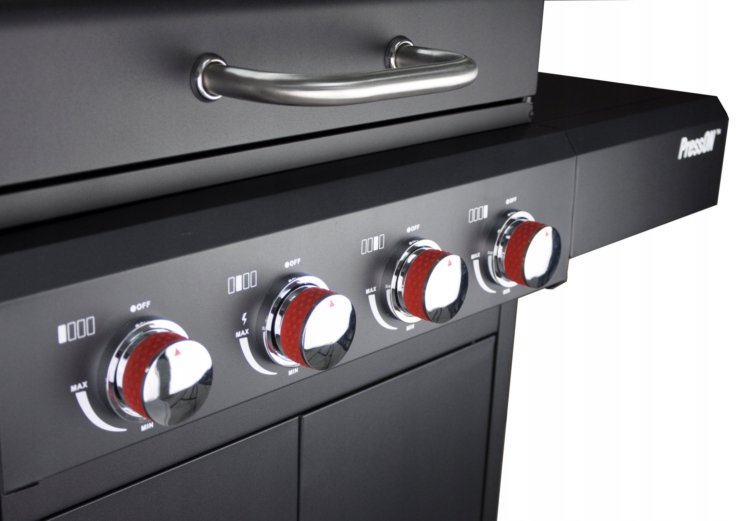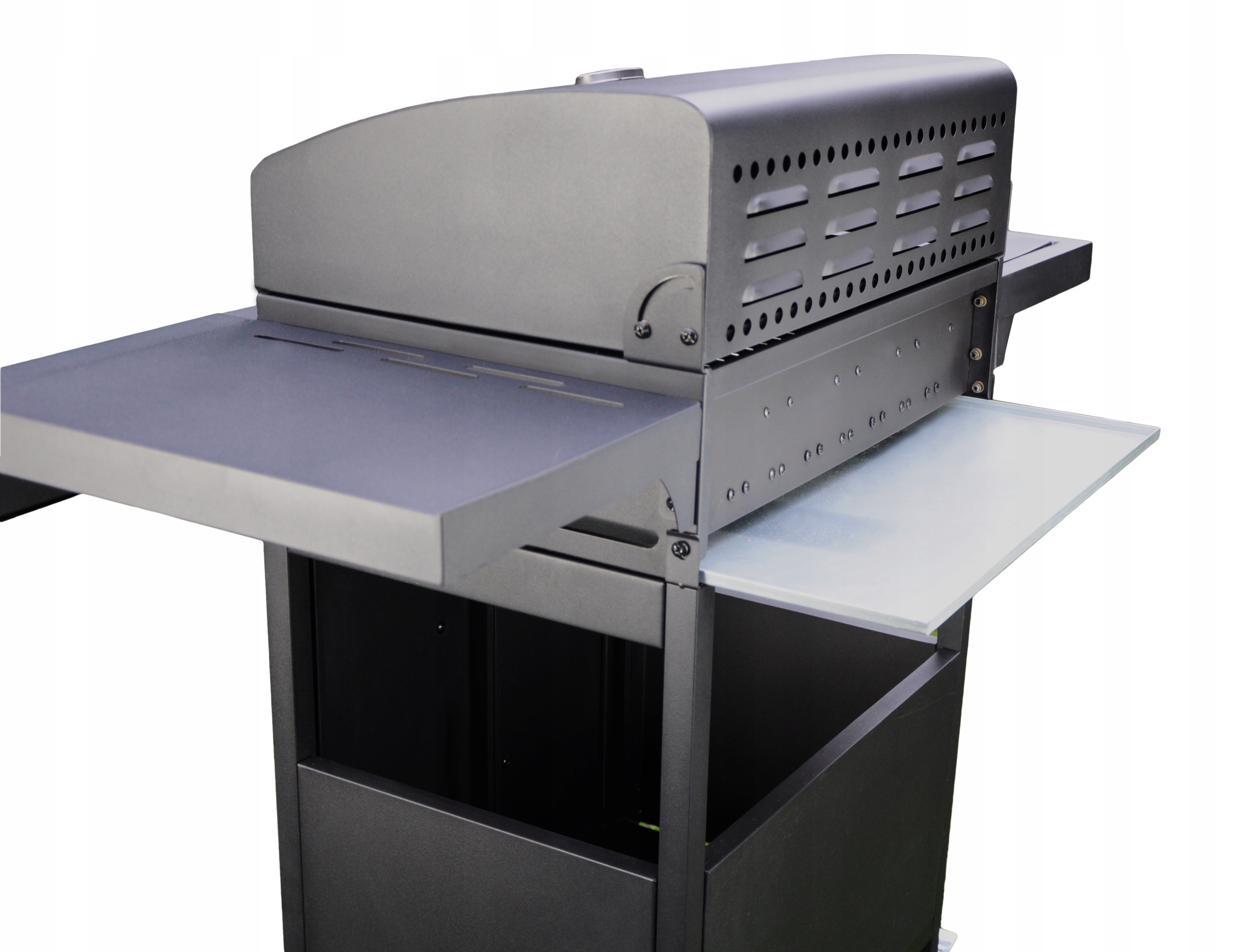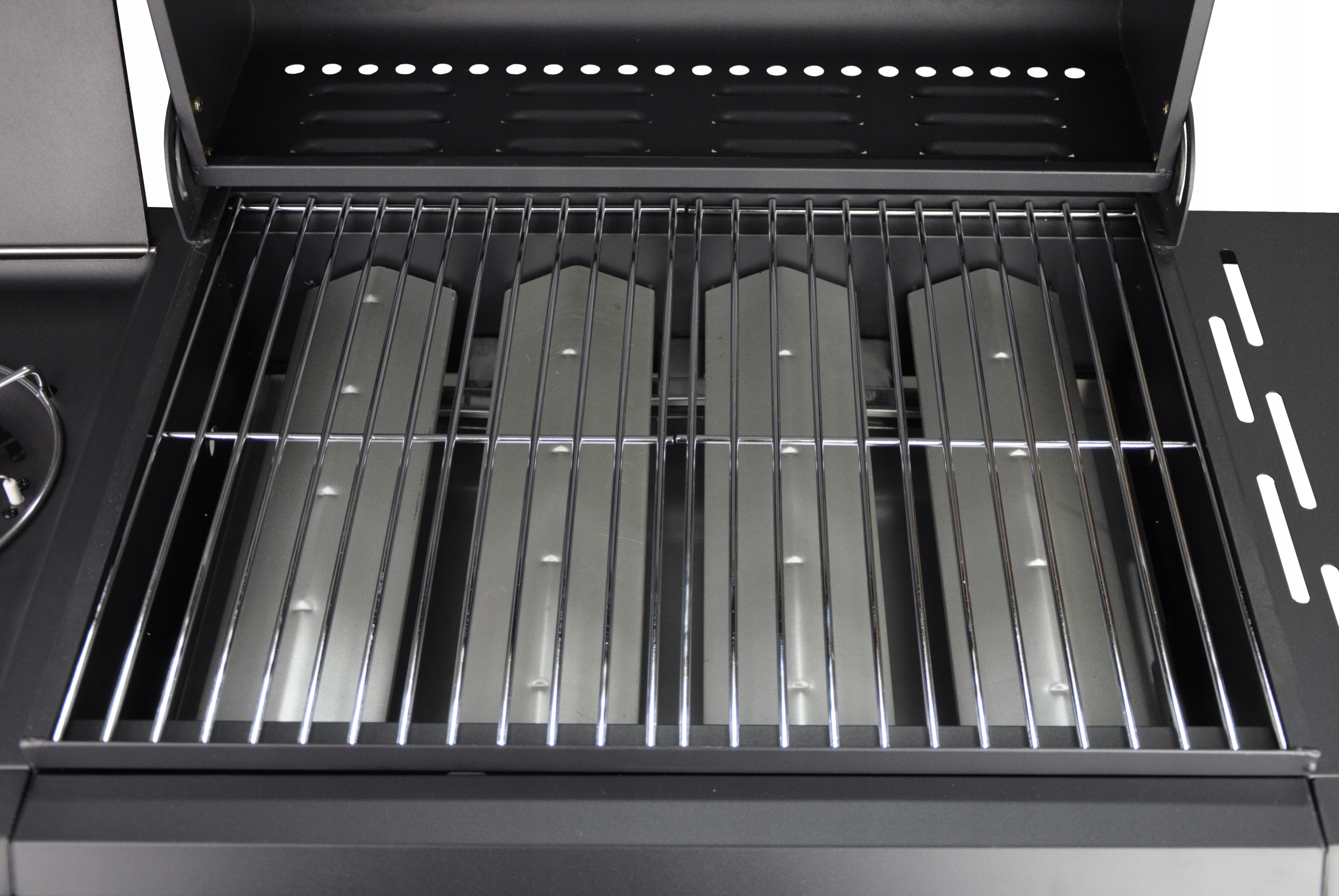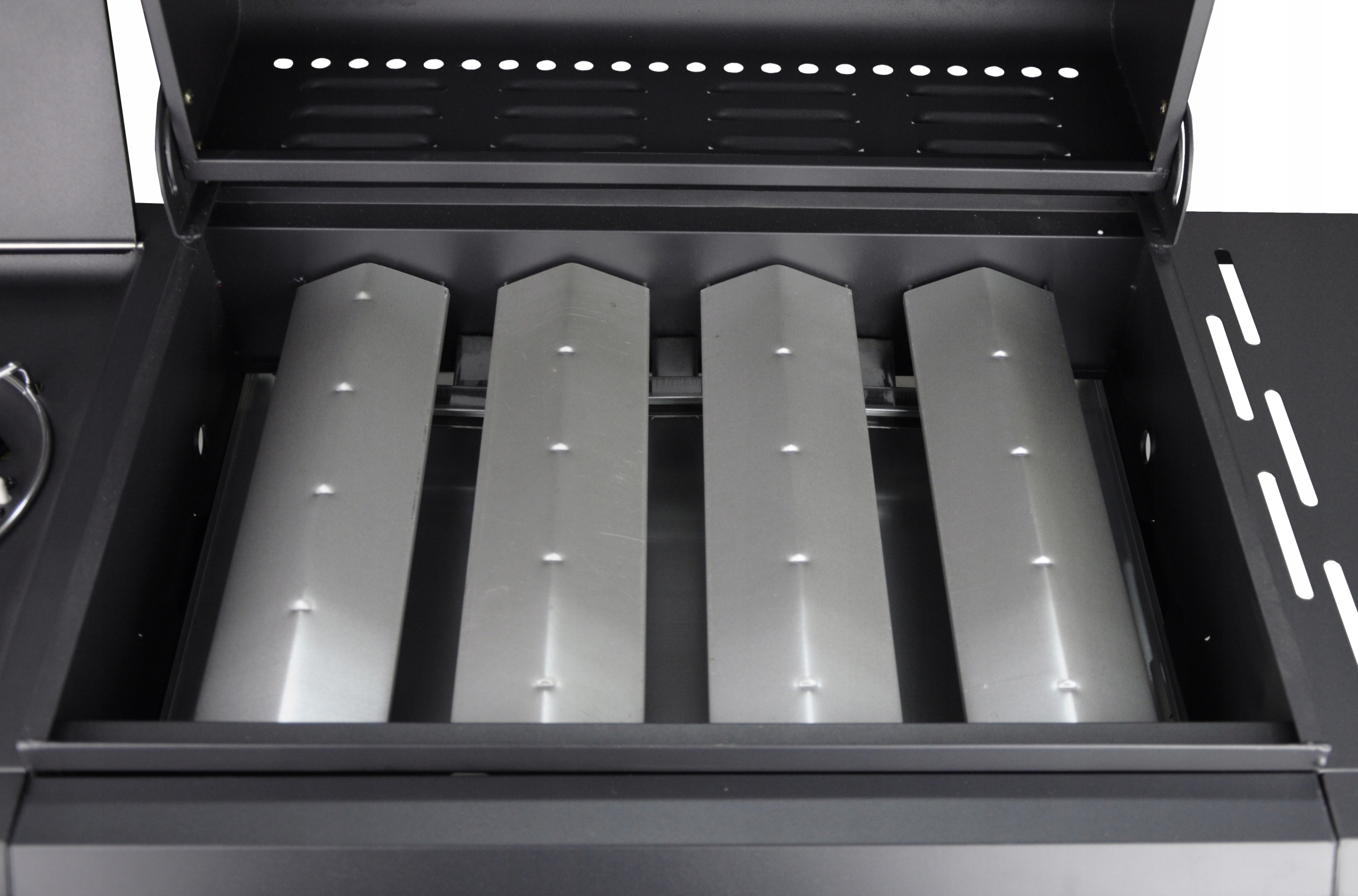 4 основные горелки - каждая горелка имеет мощность 2,8кВт. что в сумме дает целых 11,2кВт. Благодаря этому гриль очень быстро нагревается, позволяя достичь очень высокой температуры. Это особенно важно при приготовлении больших кусков мяса, например, стейков. При этом позволяет полностью контролировать процесс жарки, увеличивая или уменьшая температуру до нужного уровня.