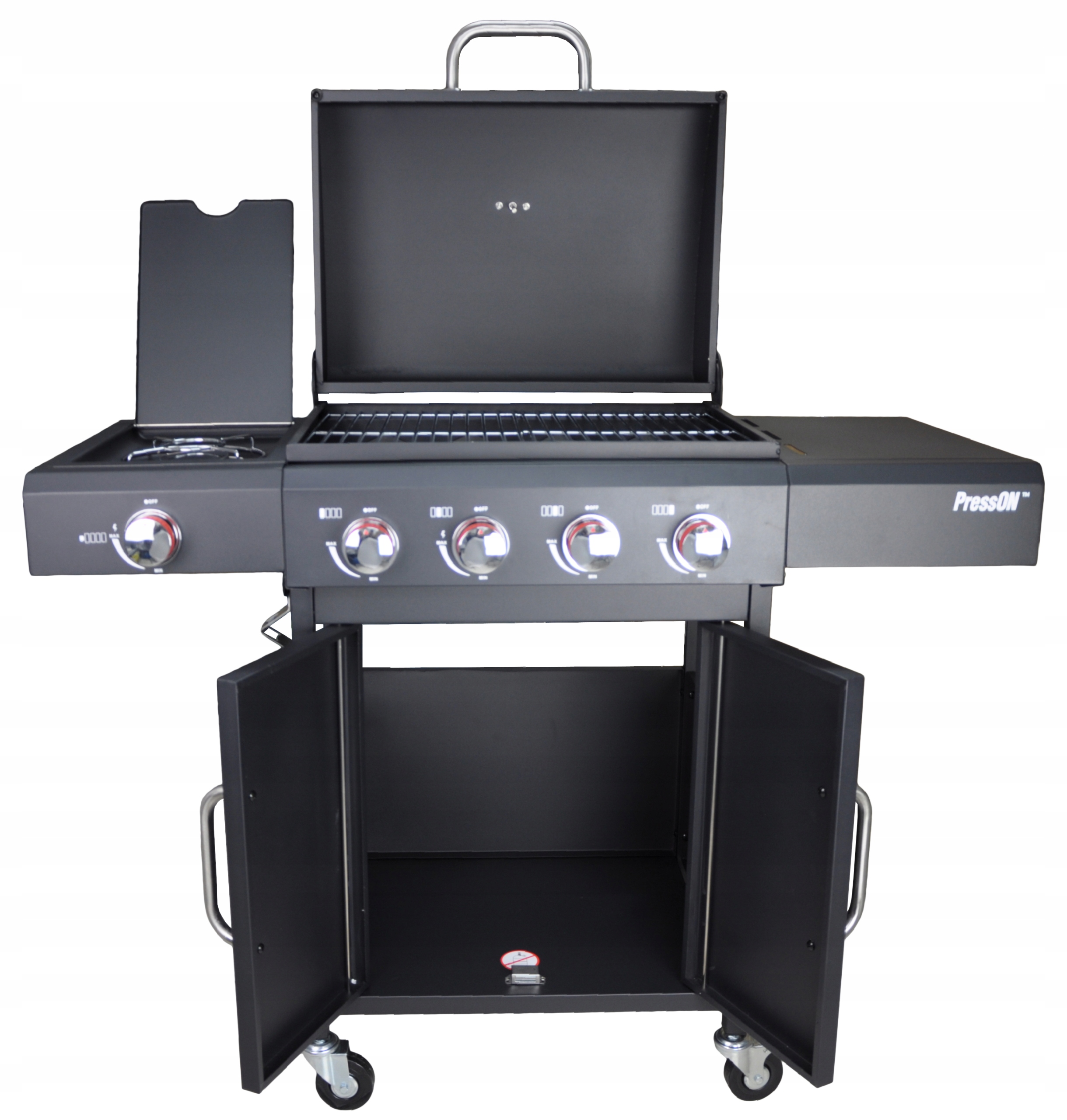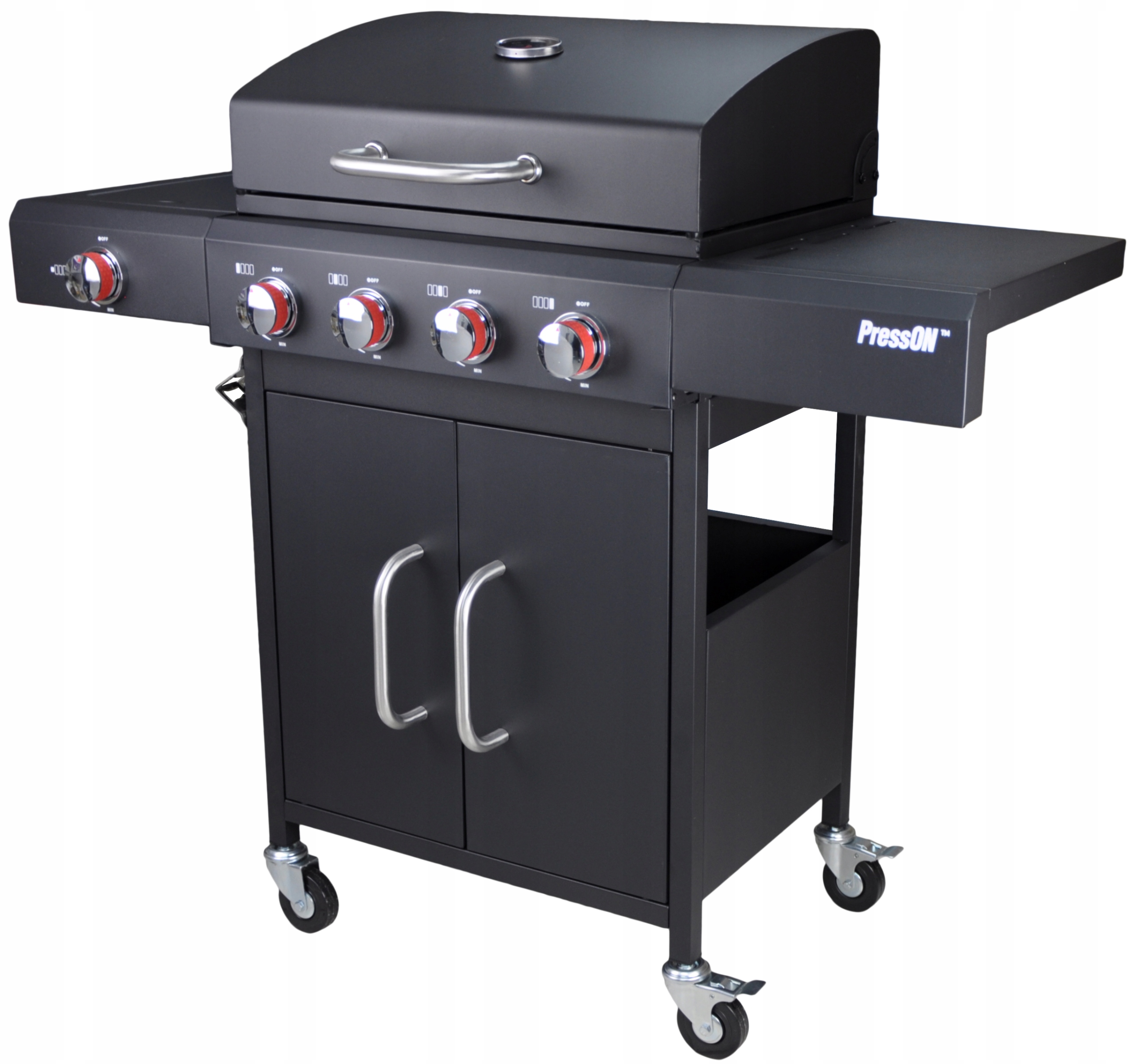 Высококачественный газовый гриль PRESSON с 4 основными горелками (4x2,8кВт) и 1 боковой горелкой (3,2кВт) в сумме мощность 14,4 кВт.